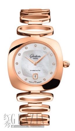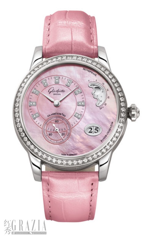 职场女性并不是一定要做别人眼中的女强人,一个温婉动人的形象有更高的亲和力!穿上线条柔和浪漫的小礼服搭配格拉苏蒂原创“心玥”偏心月相腕表,中国独家呈现的柔美粉色,外柔内刚属性展现温柔一击的女性力量,让你的美丽别具一格。2点钟方向的弯月浮雕精致显示月相盈亏,4点钟方向的大日历视窗简洁明晰,过目难忘。通过蓝宝石水晶底盖可看到格拉苏蒂原创经典工艺制造的自动上弦机芯 90-12,四分之三夹板、螺丝摆轮、双鹅颈微调机构将精密机械和艺术感做到极致和谐。