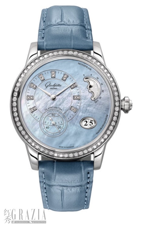 见客户谈生意,光穿的美还不够,一袭简洁利落的黑色裙装勾勒出完美身形,搭配上皓白腕间一抹闪耀散发源源不断自信光芒,格拉苏蒂原创偏心月相女士腕表助你势不可挡。珍珠母贝表盘和鳄鱼皮表带呈现清新婉约的静谧蓝,显眼又不张扬,将魅力展现的恰到好处。黄金比例分割打造的独特偏心表盘于无意间彰显高雅的审美品味。83颗镶嵌于表圈、表盘和表冠上的璀钻闪耀出华美光芒,体现源自自然的珍贵属性。