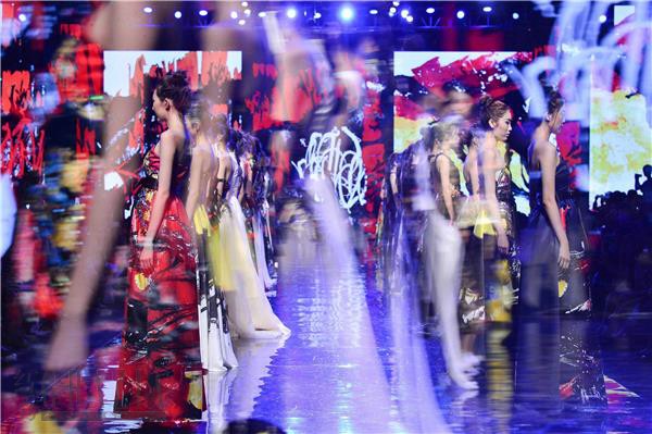 而整个秀场看起来就是一幅巨型绘画。而这幅超大型绘画又与广州国际媒体港秀场外的广州地标“广州塔”以及珠江流水、对岸的珠江新城CBD璀璨夜景融为一体,构成对广州时尚产业与时尚文化的伟大颂歌!