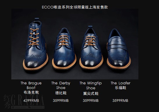 自9月24日起的一周内,ECCO VITRUS唯途系列全球限量版每天选取一个特定城市发售,包括东京、上海、伦敦、莫斯科、纽约、阿姆斯特丹以及哥本哈根。9月25日上海独发的ECCO唯途系列全球限量版主打深蓝色系皮鞋,以“蓝筹”命名,寓意对中国市场发展及业绩的期许与展望。款式包含了The Brogue Boot布洛克靴,The Wingtip Shoe翼尖式鞋,The Derby Shoe德比鞋和The Loafer乐福鞋四个鞋型。9月29日,上海即将与阿姆斯特丹同步发售的ECCO唯途系列全球限量版,则以迷彩花纹为特色,犹如资本市场变幻莫测的周六夜晚,其款式涵盖了The Brogue Boot布洛克靴,The Loafer乐福鞋和The Wingtip Derby翼尖式德比鞋三种鞋型。 每双唯途系列全球限量版鞋履都随配限量证书。