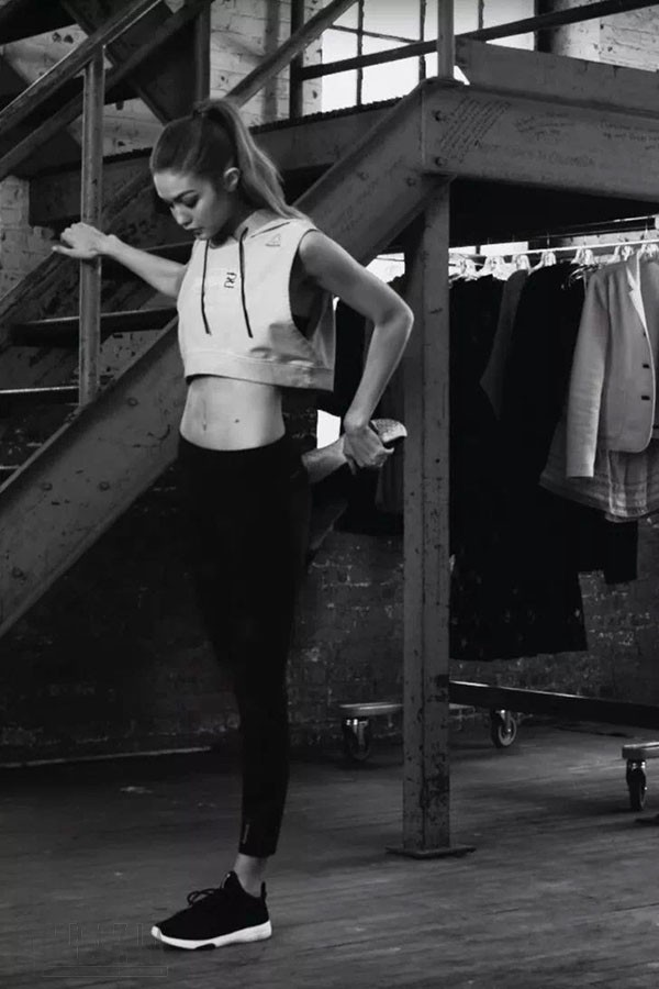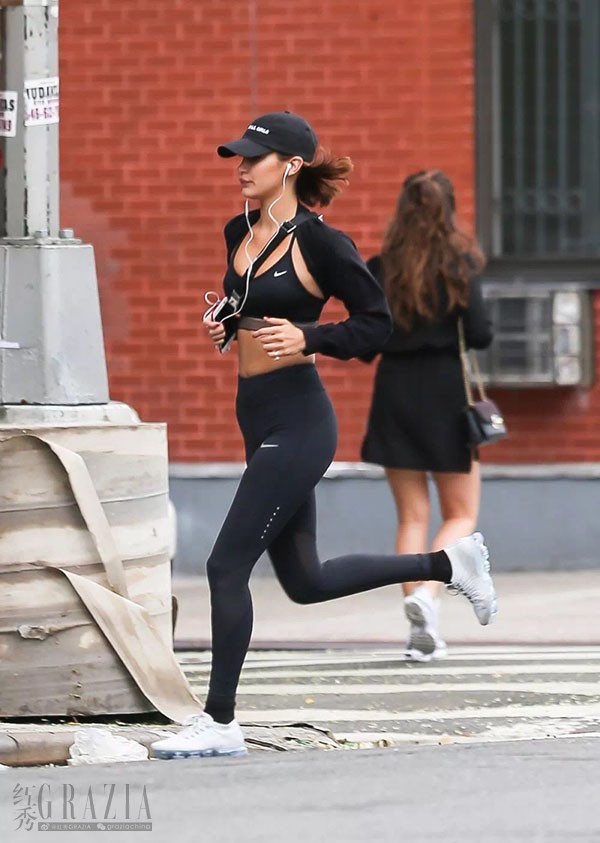 不习惯单穿运动内衣的,像Gigi 这样在外面套一件短上衣就好了,今年流行的无袖Tank背心就很合适。
