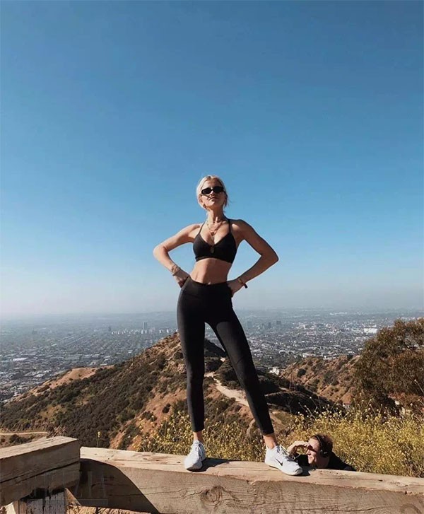 这种风格在欧美圈可以说是非常流行,紧身上衣搭配运动裤,看起来苗条,舒适度也满分。