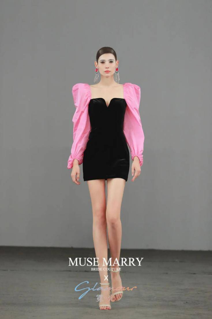 设计师将粉色泡泡袖与黑色丝绒拼接一起明亮的色彩带来的少女风又有着女生的性感成熟美。