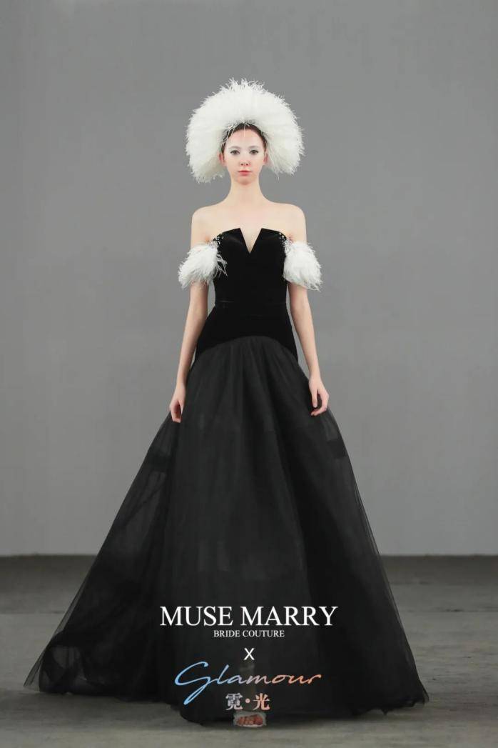 别出心裁的裙摆设计,将丝绒与欧根纱完美糅合,纯手工制作的白色羽毛,仿佛黑夜中散发着皎洁的光芒。