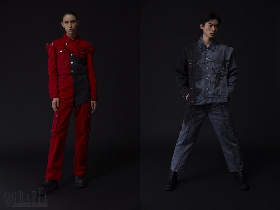本次联名系列打破牛仔剪裁规则,将传统工装口袋设计拆解重组,加之可分离的工字扣设计,以特殊的层叠立体形式重塑Levi’s® 经典单品与FengChenWang 独特的设计风格。同时,该系列单品均采用非流畅手工工迹缝纫线加之未完成概念的残留线头,体现区别于机器制作的手工自然曲线,以此向手工作业的先锋工者们致敬。在色彩语言表达上,大面积运用经典中国新年红、“工装时代”标志性蓝及蓝黑渐变色,以“中国制造”诠释中国式牛仔工装。手工擦色工艺,抒发隐藏于内心的复古怀旧情怀,演绎丹宁质感的同时,亦能跃然呈现Levi’s® 的先锋精神。