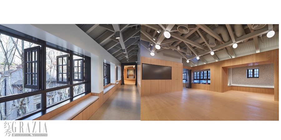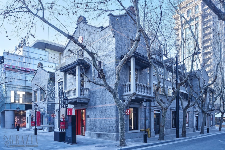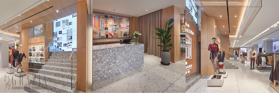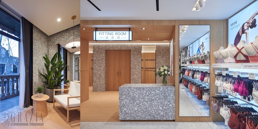 lululemon上海新天地门店位于具有上海历史文化风貌的新天地南里,品牌在保留了建筑的传统外观下,结合上海近代建筑的标志性石库门元素,实现了门店与周围环境的完美融合。开放式的醒目红色门梁入口设计敞开怀抱欢迎热情向上能量的热汗爱好者的到来。天然木材和白色水磨石贯穿门店整体的设计空间,巧妙地划分出不同区域的同时,彰显品牌倡导的自然氛围。门店设有供顾客休憩的沙发区域,绿植的装饰传递着自然清新的情境,在购物过程中亦可拥有宁静放松的时间。