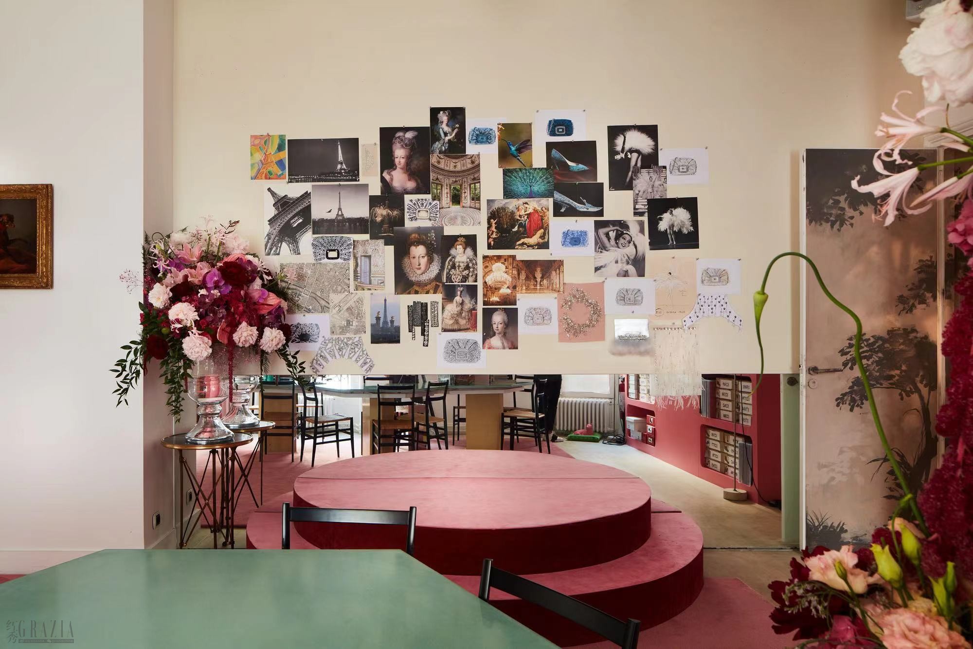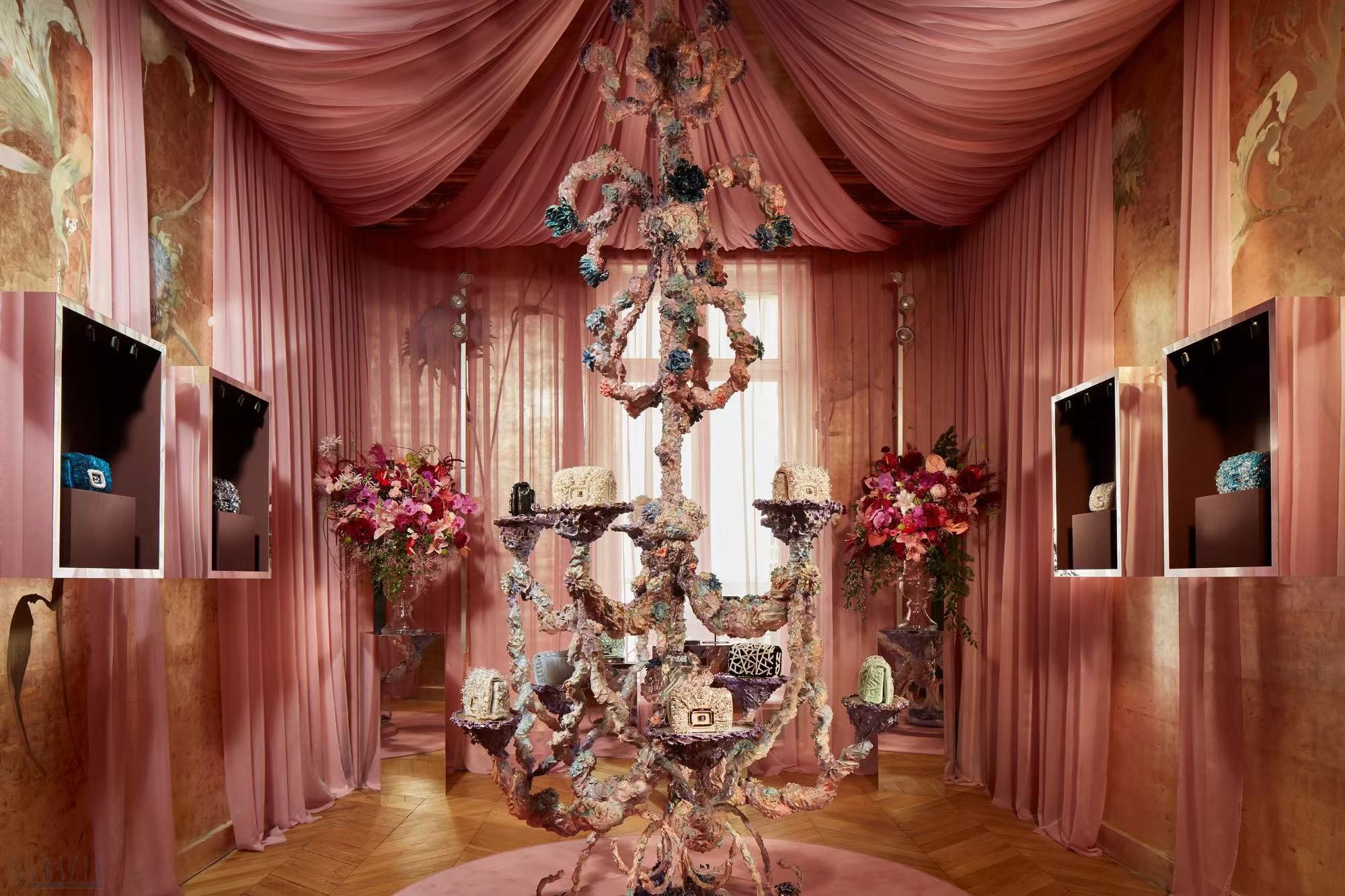 Roger Vivier 巴黎精品店大厅内,精巧包袋翩然立于溢彩流光的陶瓷吊灯之上,款款别致臻作,奏响精致刺绣与珍贵织物交织而成的华美乐章。从象牙白与玫瑰粉天鹅绒,到深色水蛇皮和冰灰色鳄鱼皮,包袋化身手工艺术品,着染单色粉彩色调,以奢华之姿颂赞巴黎风韵。 此次Viv’ Choc 高定系列包袋遵循稀有、独特、不可复制等概念,该系列突出了品牌工匠们的品味和工艺,他们在手工制作包袋时使用了高级珠宝技术,每一件都是独一无二的艺术品。