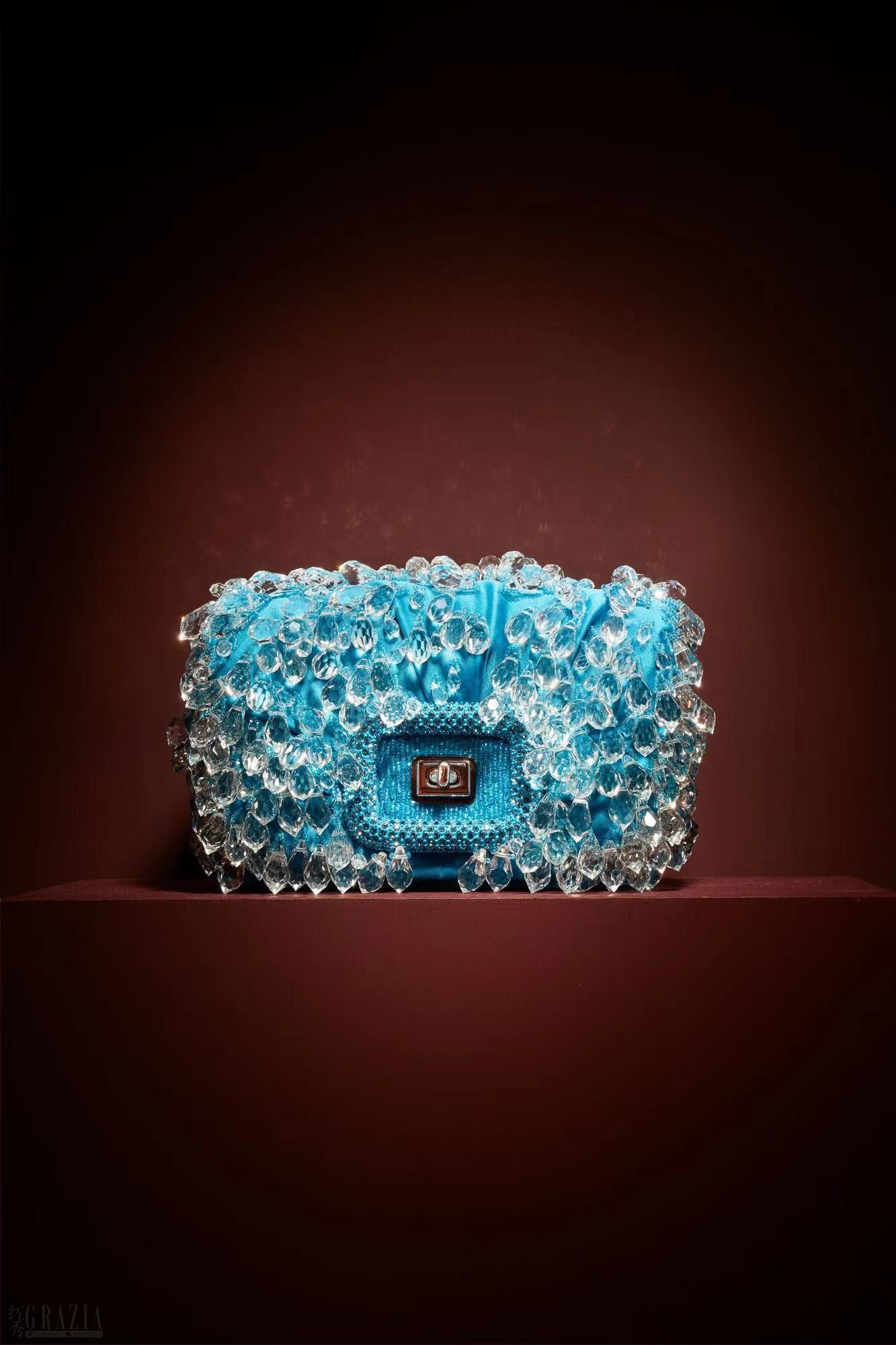 Viv’ Choc 高定系列包袋饰以浪漫褶皱与曲线,构成一方魅力四溢的感官画布,任由水晶、亮片、羽毛与精致丝线交织共舞。包袋备有标准与小巧尺寸,均由人工组装,并以手工刺绣点缀约13,000颗珠粒与水晶。从网格管珠与网眼水晶薄纱,到灵动的天然珍珠与水钻珠串,瑰丽图案与精美纹理在精巧技艺的演绎之下,绽放瞩目光采。