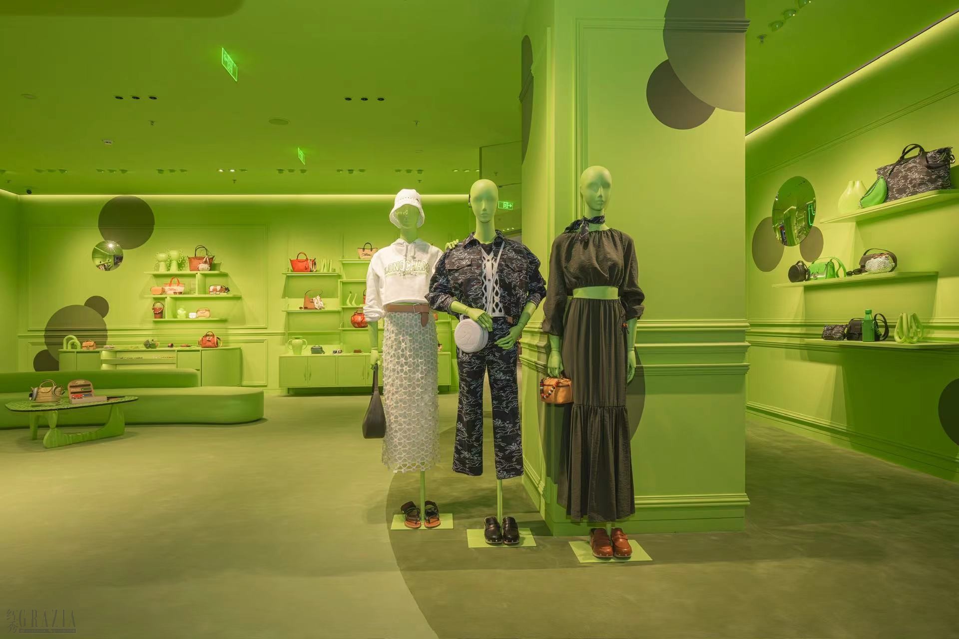 全新概念店铺以明亮活力的珑骧绿为主色调,加以简约的线条与开放式的布局,为顾客提供更加开阔的视野,以及独特时髦的购物体验。除摩登的家具和艺术书籍外,独特艺术装置也为精品店增添了个性化气息。以品牌经典的Le Pliage饺子包与标志性珑骧绿为灵感,结合镜面装置打造出无限视觉空间。当沉浸式艺术装置来到店内,随处可见的互动式打卡细节,体验与艺术的零距离,解锁独一无二的打卡创意,创作你的活力瞬间!