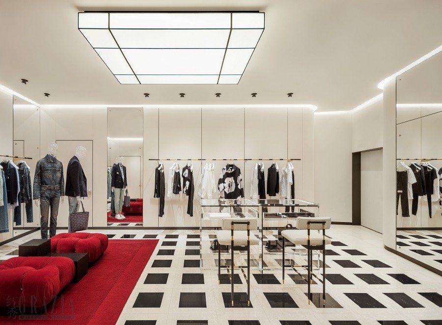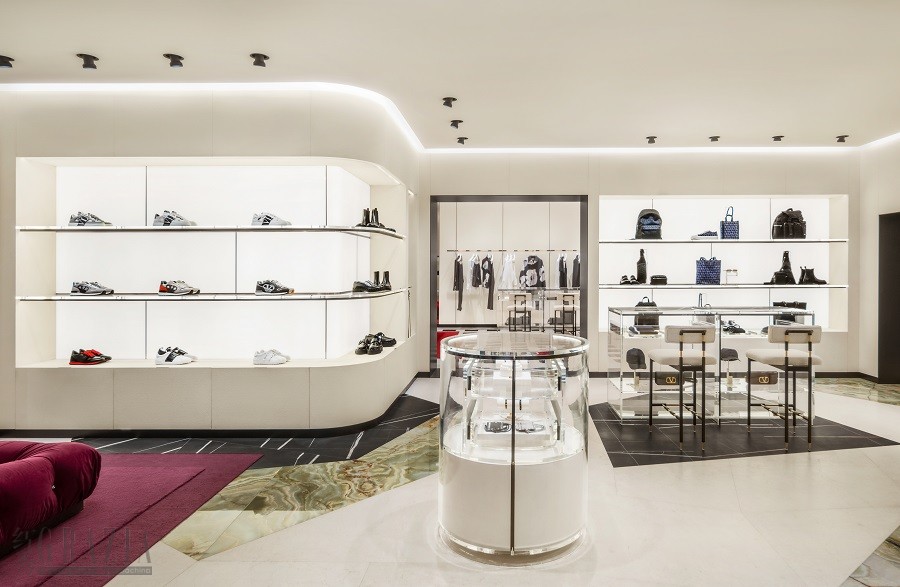 全新精品店的内部设计无一不彰显意大利高定品牌的匠心精神和美学理念,代表着Valentino作为意大利顶级高定时装品牌的定位。地板由带有标志性几何图案的Botticino大理石、Sahara Noir大理石和木质材料组合而成,营造温馨、雅致而低调的奢华感。店内装饰的材质与色调别具一格,点缀有罗马建筑风格元素,为顾客打造舒适的购物环境、享受私密的购物体验和独有的贴心服务。