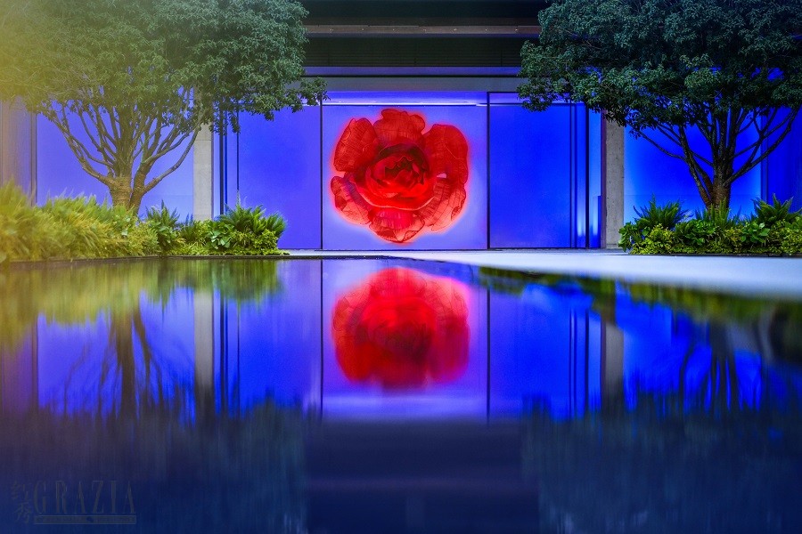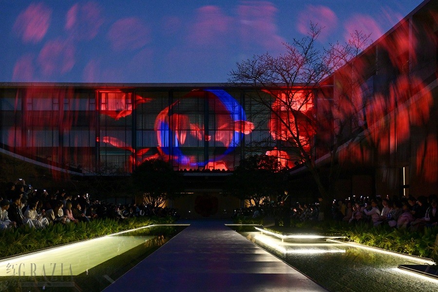 大秀于雅莹时尚艺术中心精彩上演。开场前,蓝色丝绸随着国风音乐的节奏,轻快地飘荡在由建筑大师张永和设计的合院,红色丝绸也随之一并飞扬。随即,伴随着牡丹花瓣漫天飞舞,一朵巨大的牡丹徐徐盛放,在它的引领下更多牡丹相继绽开,正如蓬勃发展EP YAYING 雅莹带着美与文化的使命与各方联动,共同推动时尚文化的兴盛。3D裸眼科技从视觉上升华了品牌两大代表性元素牡丹与真丝的美学联系,品牌两大经典色蓝与红在夜空显得尤其闪耀,宾客在光影流动、虚实相生的氛围中,感受品牌多元魅力。
