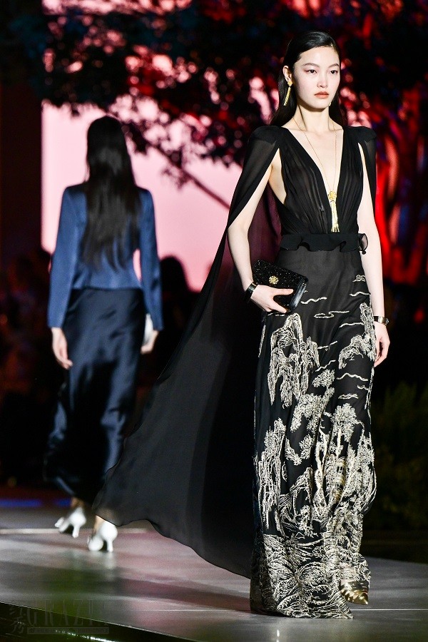 黑色礼裙的纹样灵感源自中国明代绘画中的游春图,裙摆上的刺绣经过不同的绣法层层叠加,经过240个小时的工时刺绣,再搭配水晶钻片等材料点缀,才描绘出山川楼阁、碧波荡漾的美景。