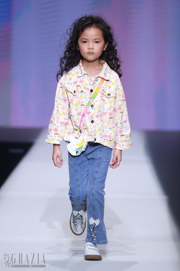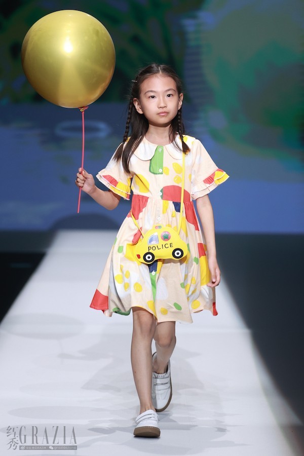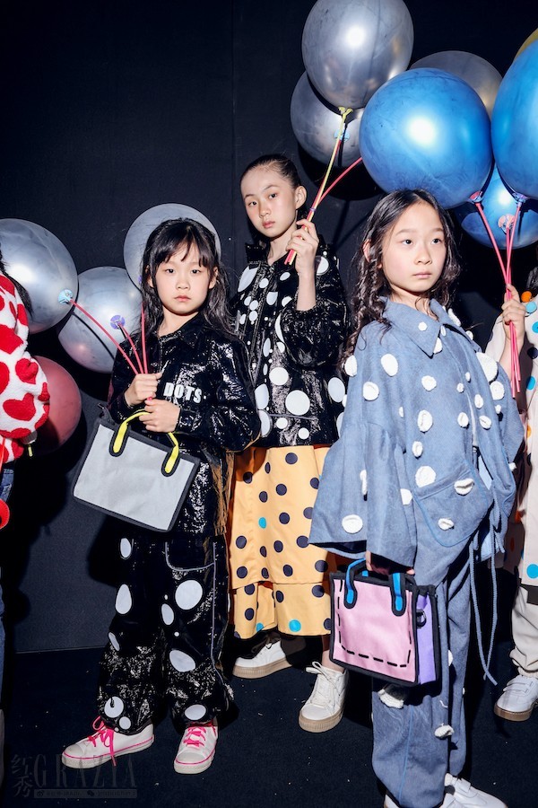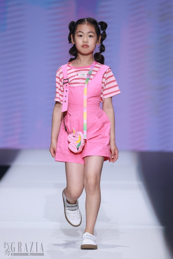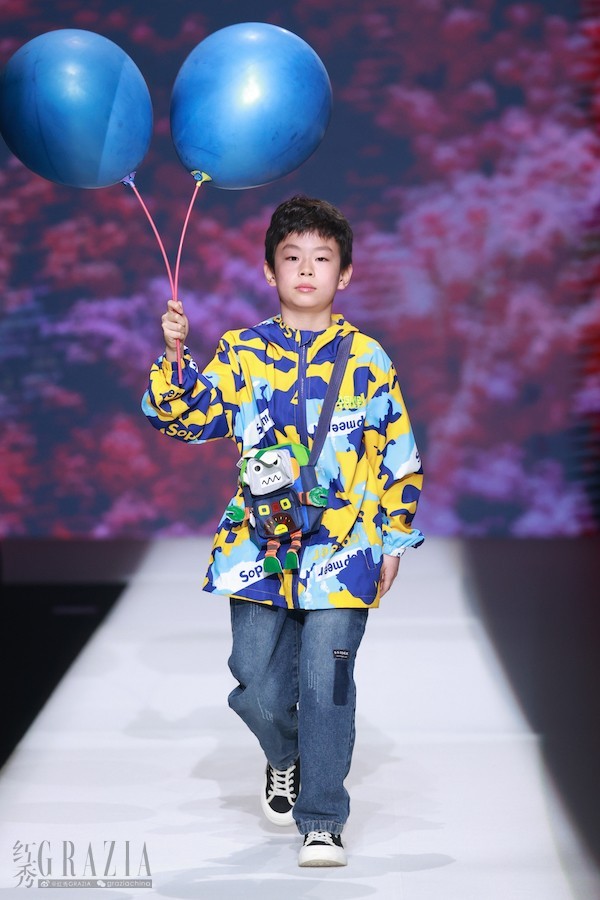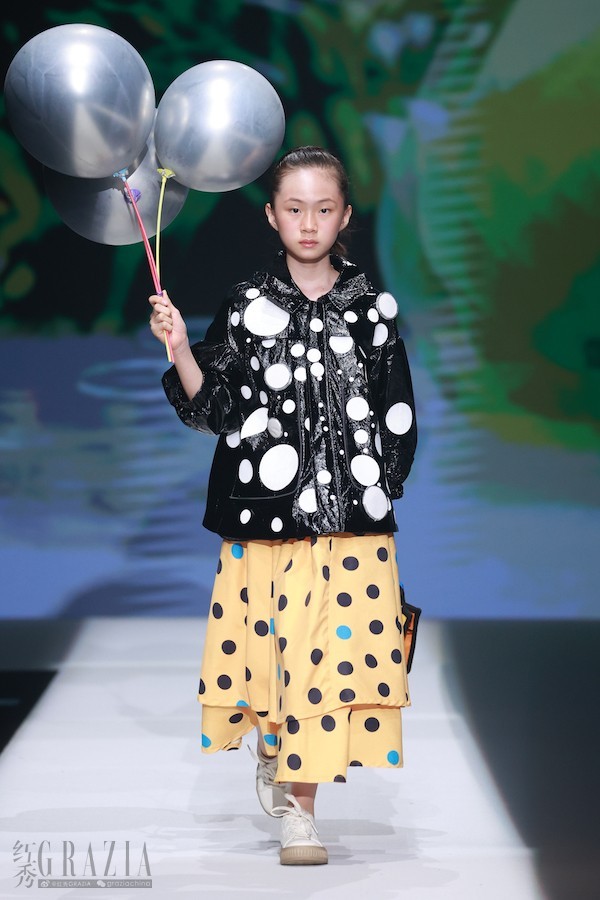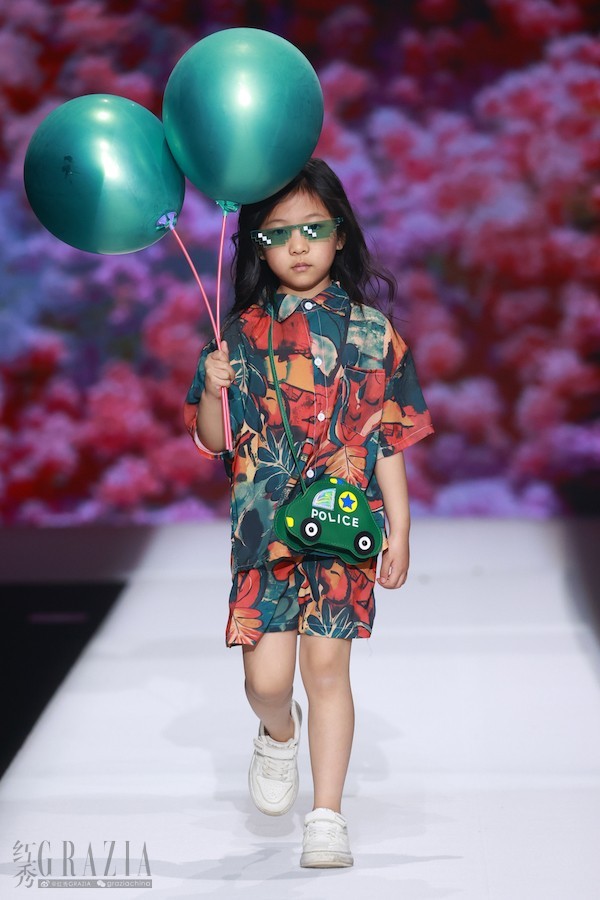 带有童趣幻想的“流转”系列令秀演现场的梦幻氛围得以进一步升华。多变的渐变色成为本主题系列下值得关注的元素,色彩选择上既可通过相近色系的和谐过渡凸显柔和愉悦的美学效应;也可通过对比鲜明的颜色组合彰显带有潮流张力的童真遐想。图案设计丰富多元,包括格纹、条纹、波点、变形字母、卡通动物、唯美花卉等结合蝴蝶结、荷叶边等元素将孩童的可爱特质无限放大。
