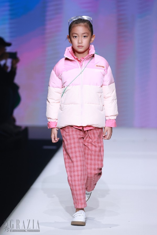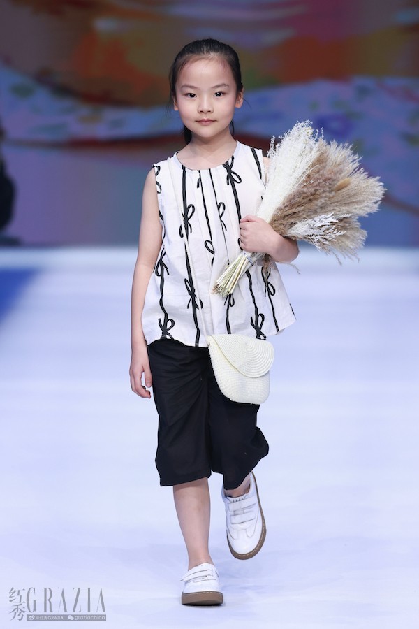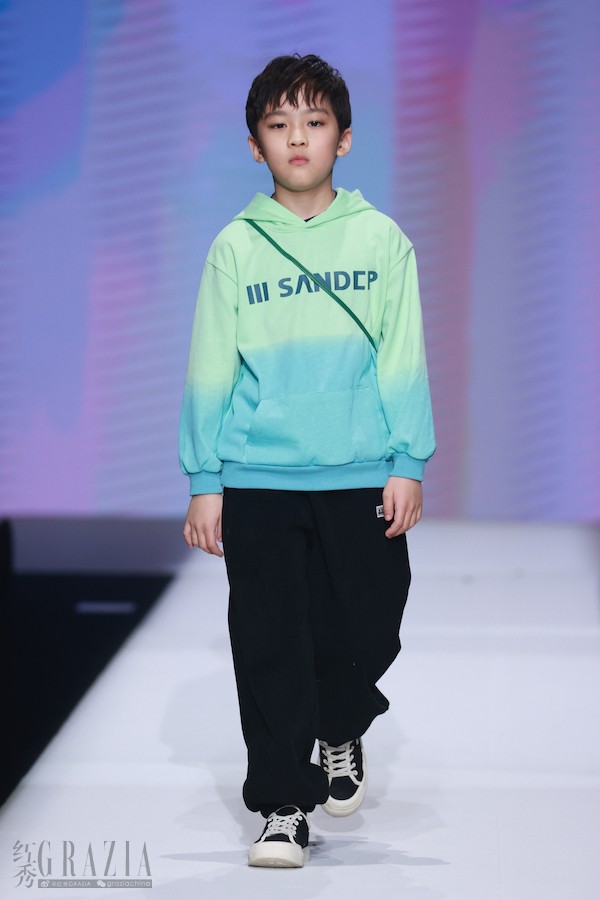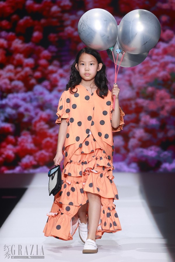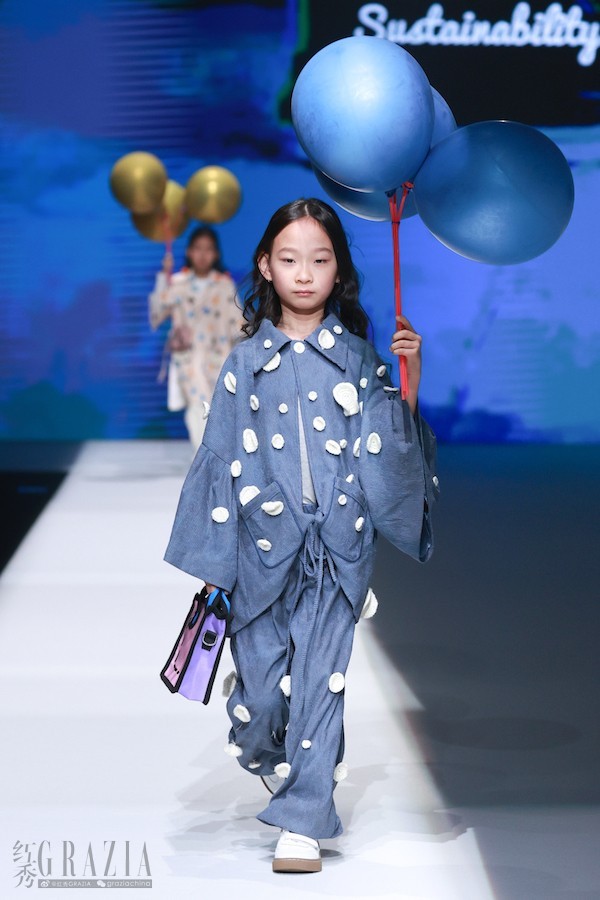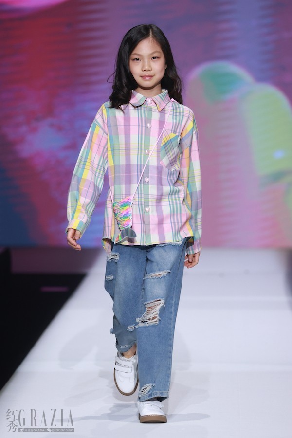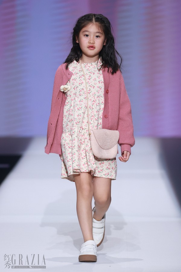 带有童趣幻想的“流转”系列令秀演现场的梦幻氛围得以进一步升华。多变的渐变色成为本主题系列下值得关注的元素,色彩选择上既可通过相近色系的和谐过渡凸显柔和愉悦的美学效应;也可通过对比鲜明的颜色组合彰显带有潮流张力的童真遐想。图案设计丰富多元,包括格纹、条纹、波点、变形字母、卡通动物、唯美花卉等结合蝴蝶结、荷叶边等元素将孩童的可爱特质无限放大。
