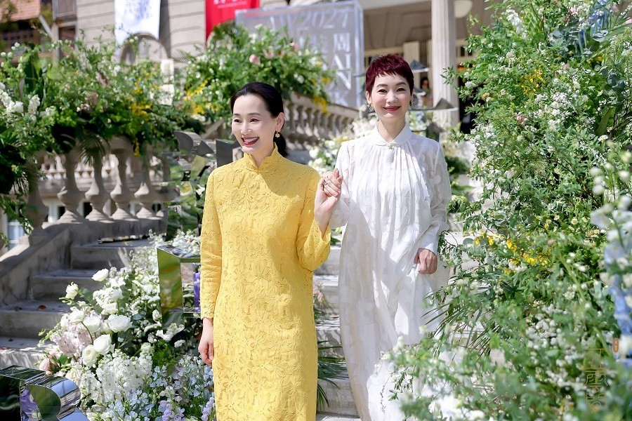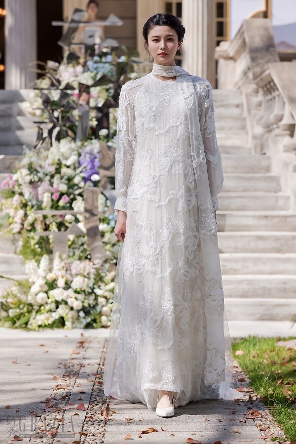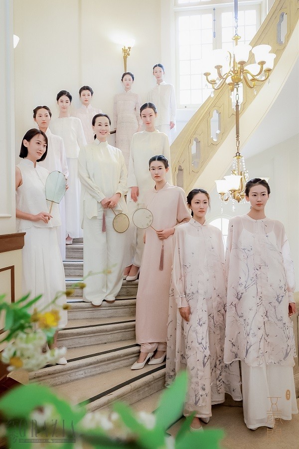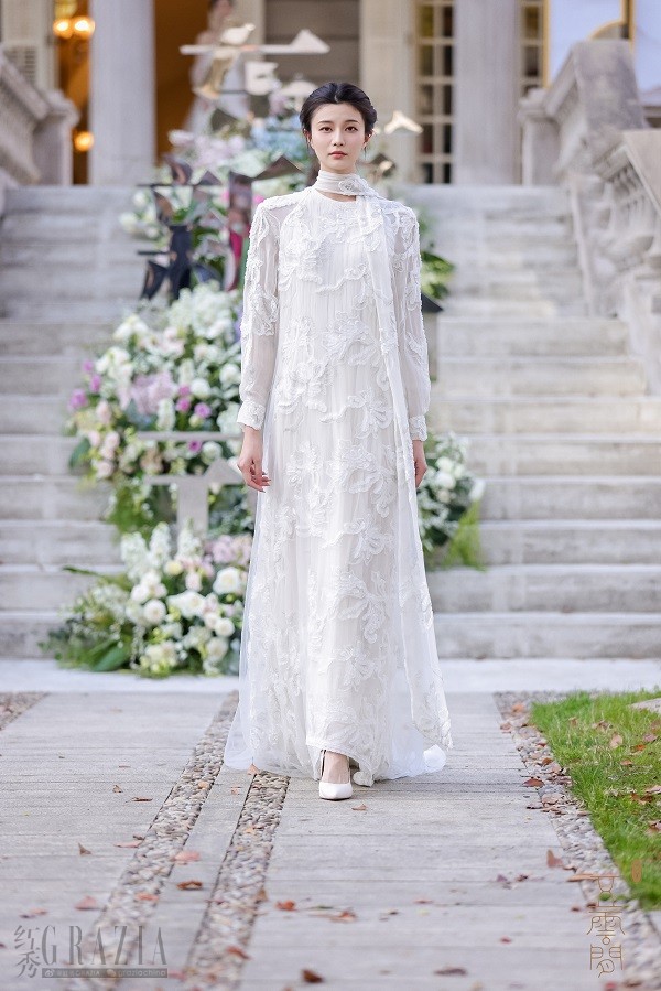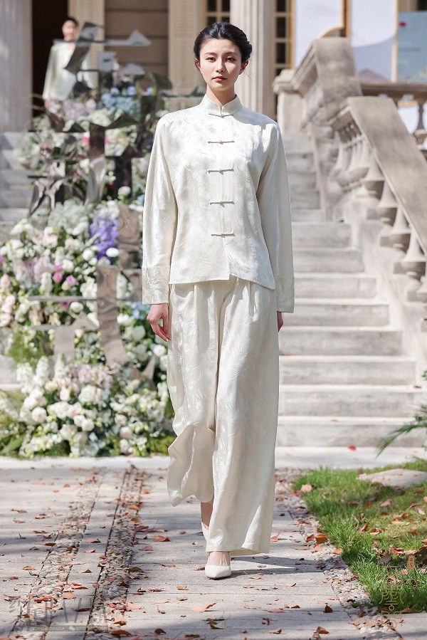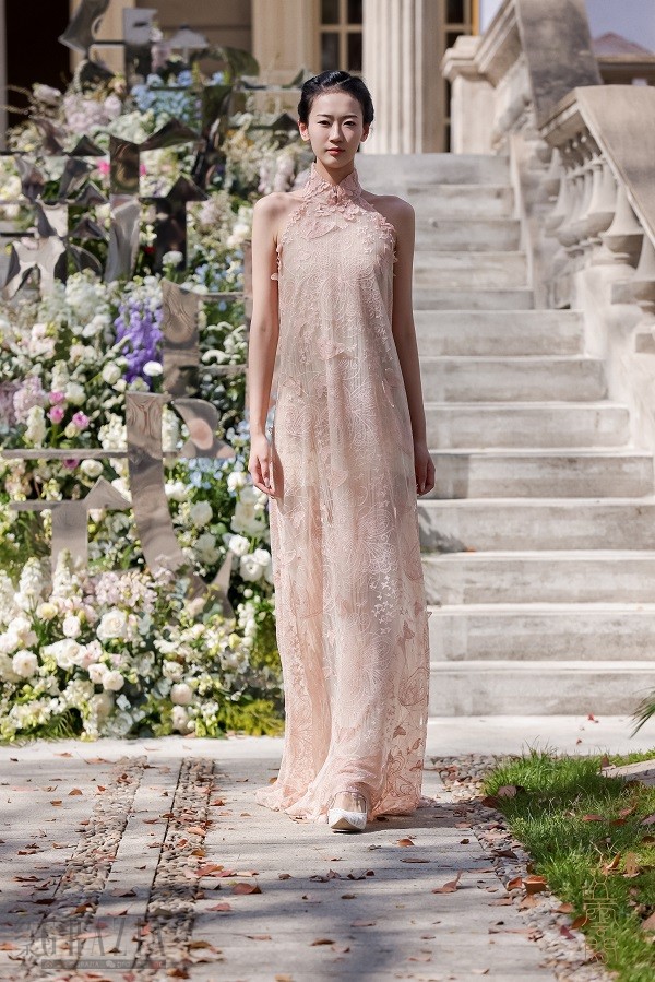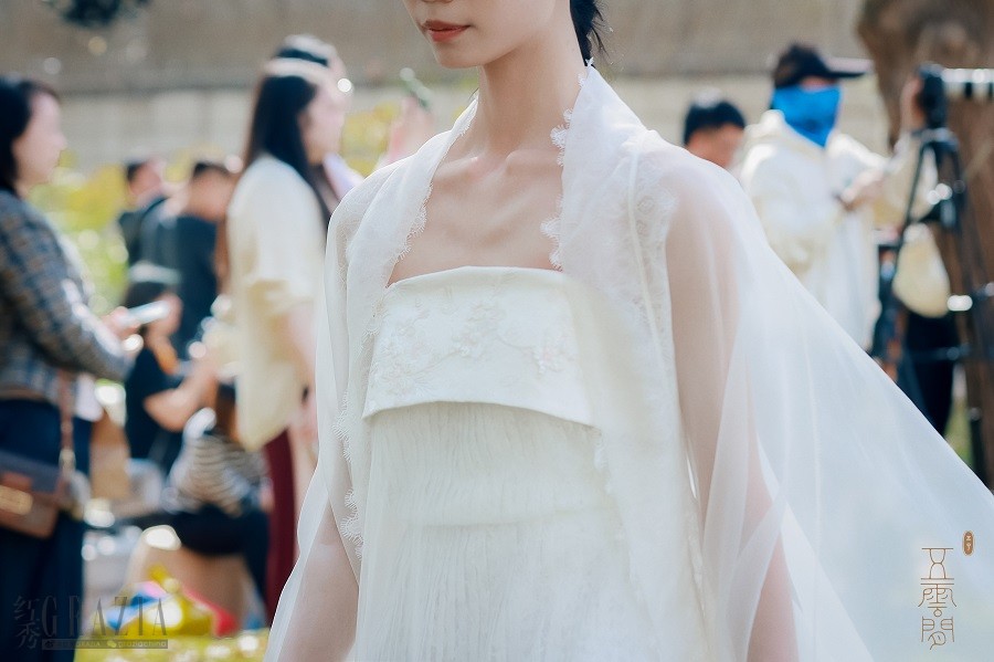 随着一段熟悉的旋律飘然而至的是著名沪剧演员郜逸萍带来的《茉莉花》沪歌演唱,这首改编自江南民歌的音乐作品委婉流畅,特色鲜明,不仅深受中国人民的喜爱,更因契合了普世审美习惯而蜚声国际,成为中外文化交流的典范。用这段优秀作品引出五云间本次“兰·蝶”系列发布大秀,可谓匠心独具,神来之笔。一阵空灵的碎铃音带出质朴的古琴和萧声,身穿30款五云间最新发布的吉服、常服、礼服的婉约女子缓缓步出,三三两两或凭栏倚立,或执扇扑蝶,或对花轻语,或相视而笑,一派春光明媚时,佳人园游绮梦中,绝佳地演绎出五云间“心生欢喜,常得自在”的自在美学核心精神。