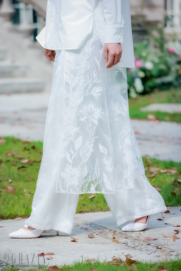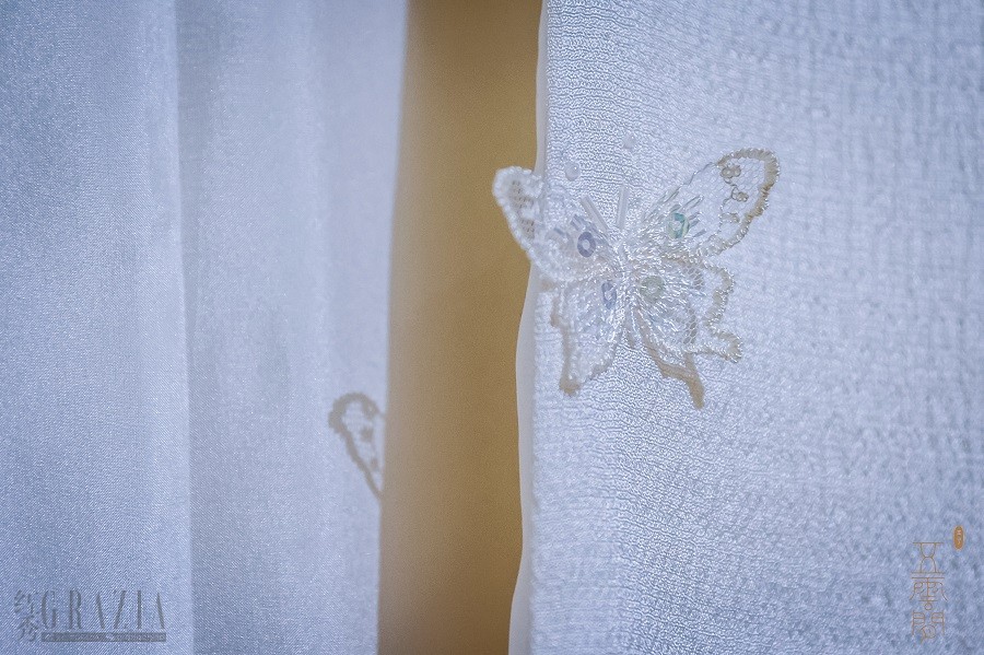 本次展出的一款重磅创作 -《蝶恋花》,创意源自现收藏于上海博物馆的宋代女画家艳艳女史唯一的传世佳作《草虫花蝶图卷》。静室轩窗下,娴静的绣娘独对一架绣绷,运指如飞,辟丝如拨弦,针线为笔墨,丝线化丹青,针尖起落处,绣绷上渐次生出兰草、繁花、禽鸟、祥云、蝴蝶......惟妙惟肖地再现宋画中的工笔花鸟图卷,园苑坡地、湖石间,一派秋光明艳景象,奇卉异草,千姿百态,飞蜂舞蝶,上下翻飞,天地自然的轻灵之气,各具姿态,无一雷同,环绕衣袂,跃然欲出。一枚叶柄要动用四五种绣法,一朵花的晕染有着六七道渐层,一枚蝴蝶的羽翼上,缀着丝带和钉珠双重华彩。为了呈现大花秋葵在原画中接近透明的白与粉,设计师用同色的欧根纱,一针一线手工缝制成绢花,再缀上花枝。绣娘采用了包含苏绣、打籽绣、套针绣、裹针绣、插针绣、米字针、钉珠绣、丝带绣等十几种绣法技艺,以及自创的新针法,耗去近千工时,正可谓待到满园春色时,流年已将人抛却,在寸心无旁骛、埋首锦绣中,静好的时光与纯良的丝线缠绵悱恻,脱胎而出五云间的“镇店之宝”。整件华服以素白真丝欧根缎为底,兰草摇曳、繁花竞放、蝶舞翩跹,技艺繁重却不失轻灵典雅,华丽富贵而更显脱俗清丽,简约大气的袍衣廓形淡若春风,收得一派生动烂漫于静无声息中,完美诠释出女性特有的精巧细致、温柔缱绻、柔美仙灵之气。近期大热的电视剧《繁花》活色生香地呈现了一出汇聚百年上海、勇立潮头绽放的世间女子群像,五云间则借一方锦绣繁花,告诉世间所有女子:你若盛开,蝴蝶自来。