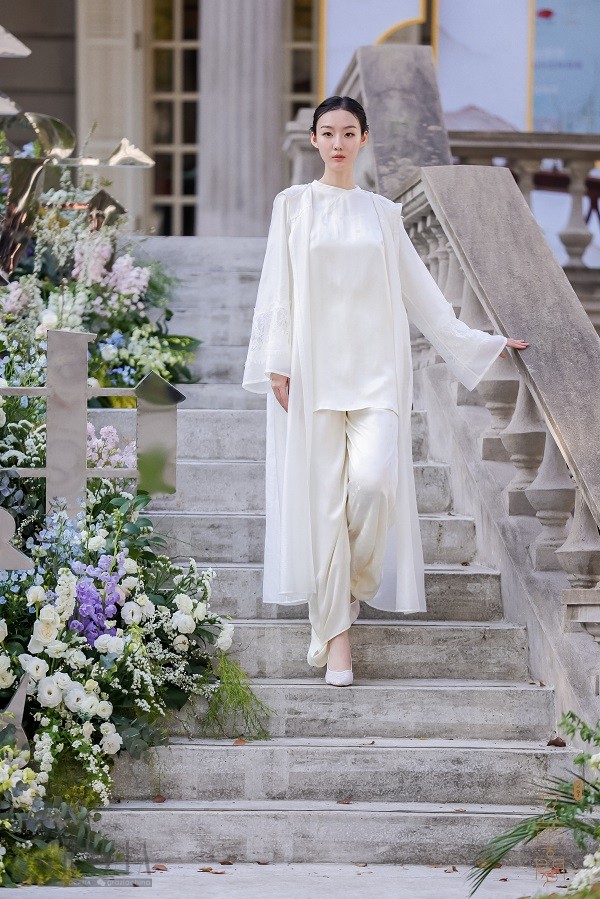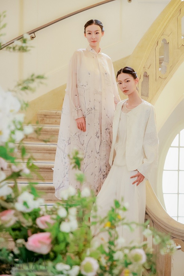 兰生于幽谷,却不以无人而不芳,独与天地精神往来。作为中国文化标志性符号象征的兰,亦是五云间的品牌精神所寄。兰以素为贵,以清为本,发布会服饰便以月牙白等具有鲜明中国文化特色的颜色为主调,凸显兰花“素心自芳洁”的本质。兰有“王者香”,见闻无心处,即五云间强调的“神韵”之美。兰花品类众多,然各有高致,高洁、婉约、飘逸、幽静......亦可对应每一位穿五云间服饰的人之特质。蝶,典出“庄周梦蝶”,寓虚实相生的艺术游心之境。若把兰比作实境中的你我,蝶便是幻化的我们,游园绮梦,出入无碍,于自由之境探寻自我真性。蝶,既是代表美的精灵,又可指代纯粹的精神体验。而兰、蝶之间的梦化,乍醒之际物我界限被模糊的恍惚一瞬,是中国哲学里“天人合一”的思想,寓意人与自然的和谐。五云间用优雅传统色及稀有甚至孤版的顶级天然面料,结合刺绣、手绘、钉珠、拼嵌等传统手艺,倾心打造 50 多款全新作品来做主题的艺术表达。