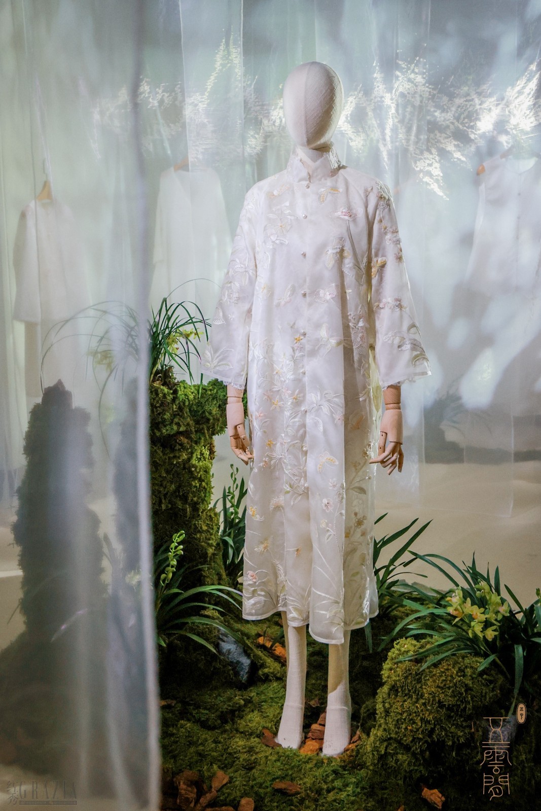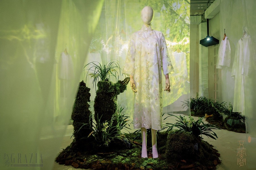 五云间以艺术展的规格和品质为指导原则,调动幽兰、蝴蝶、纱幔、特制香氛、微风、音乐、雾霭、光影等众多元素,立体打造一个充满东方美学的意境空间。本次发布的“兰·蝶”系列作品,飘逸的材质与精美的工艺相得益彰,通过五云间标志性的中国袍衣廓形,完美表现兰花外在柔美,内核坚韧的卓越风姿,蝴蝶的灵动更让五云间一以贯之的东方含蓄雅致的极致生活美感栩栩如生,趣味盎然。嘉宾与模特们,身着华服穿梭其中,亲身演绎古人崇尚的“涵泳”赏美方式,身心灵全方位地感受美学生活的随心而塑形,任心而自在。