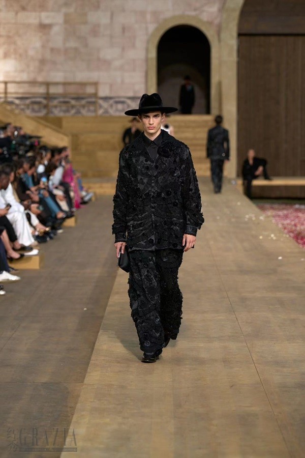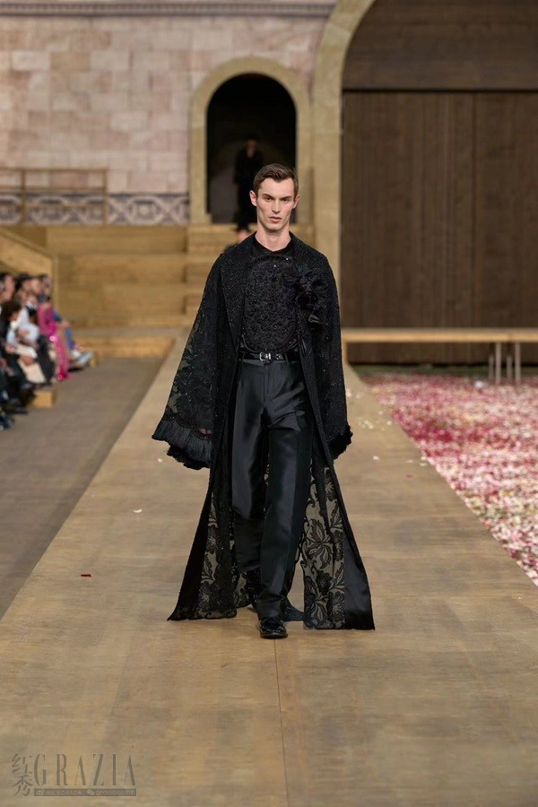 本季男装高级定制系列从意大利传统节日 Sant'Efisio 节与撒丁岛民俗中汲取灵感,跃然映现于装饰图案、珍贵材料与精湛匠艺中。花卉图案以多种形式精妙呈现,包括斜针绣、钩编以及管珠、 水晶、墨色珠饰与金银线刺绣,重现 Sant'Efisio 节期间的花毯盛典(infiorata),致敬在节日期间 将玫瑰花瓣洒满卡利亚里街道的传统习俗。