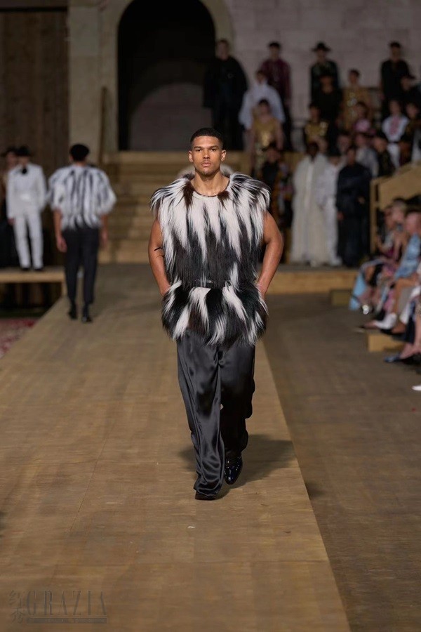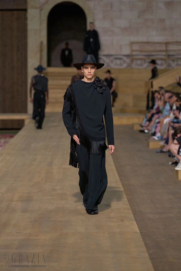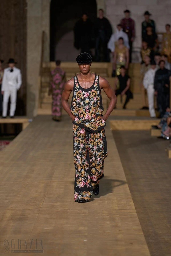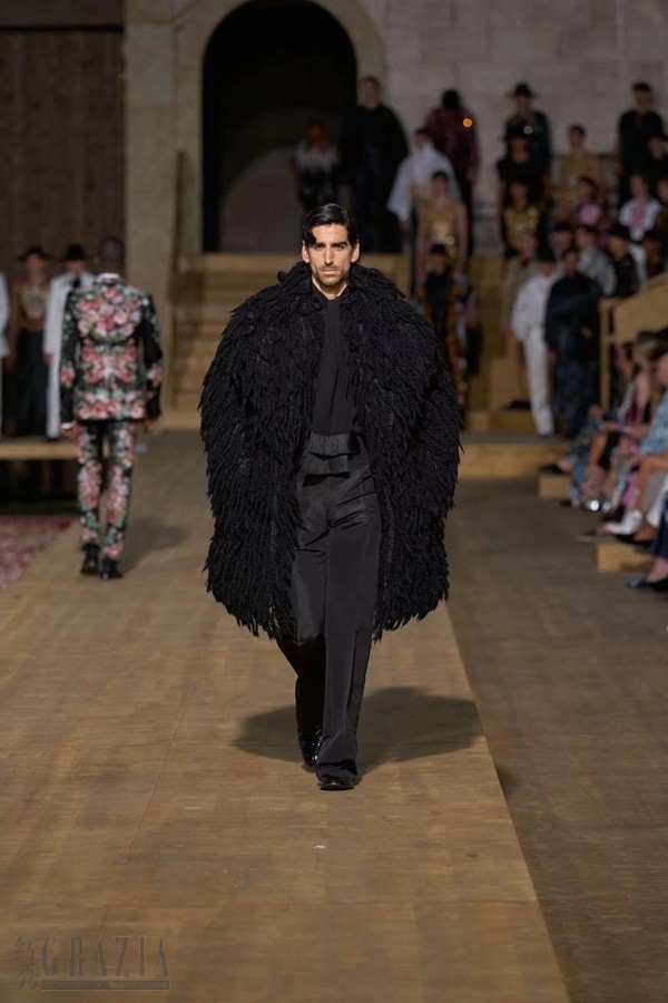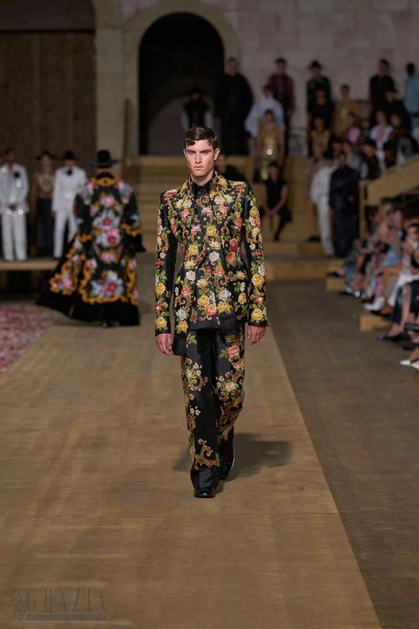 撒丁岛服装丰富多样,承载着多年来栖居于岛上的多彩文明,此次男装高级定制系列亦是如此。 该系列巧用多种材质:从云纹面料到装饰优雅荷叶边的蕾丝,再到致敬传统 bolero 波列罗舞曲外套的金线刺绣天鹅绒。