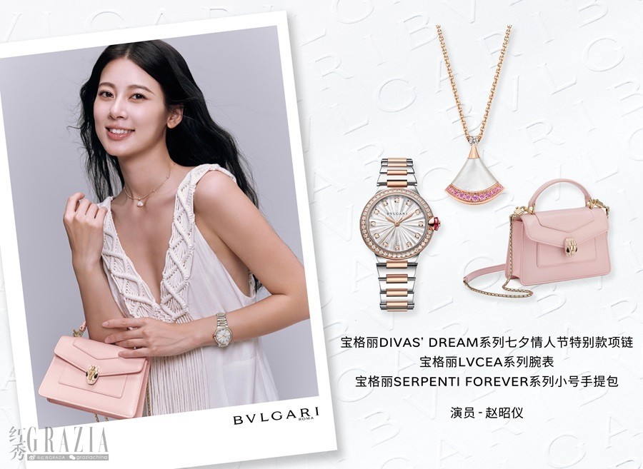 爱意匿于日常,篆刻点滴时光。演员赵昭仪佩戴Divas' Dream系列七夕情人节特别款项链与Lvcea系列腕表,以珍珠母贝搭配粉色蓝宝石,绽放丰盈光芒。宝格丽Serpenti Forever系列小号手提包满载粉色记忆,赵昭仪和赖美云展露活力满溢的青春气息,珍藏专属于她们的美好期许。