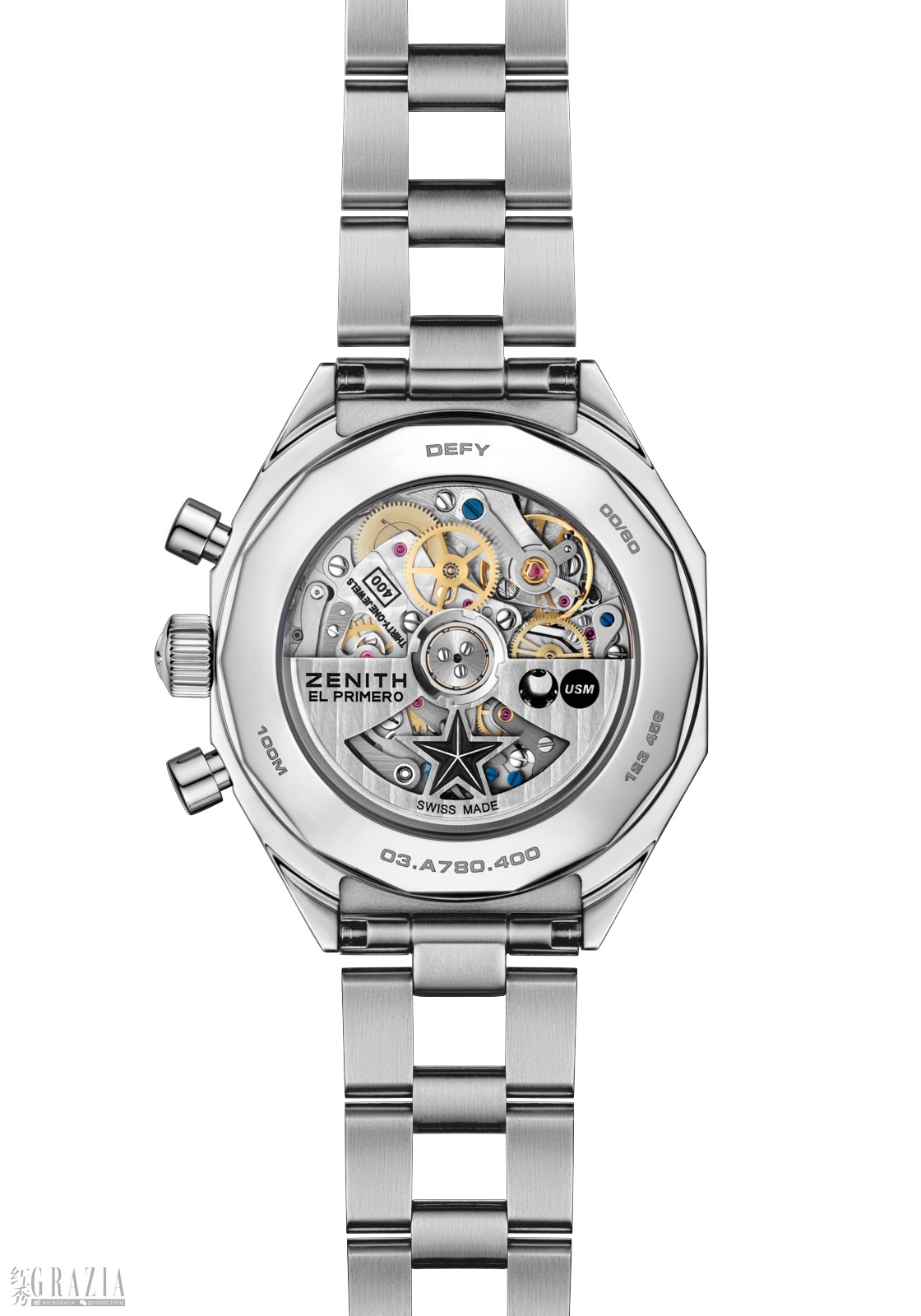 DEFY巅峰系列计时码表USM限量版内部搭载具有传奇色彩的El Primero 400型机芯,承袭自ZENITH真力时于1969年倾力推出的全球首款高振频自动上链计时机芯——El Primero 3019 PHC型机芯。逾55年以来,这款机芯凭借5赫兹高振频擒纵机构、自动上链系统及导柱轮计时结构,至今仍为精密计时领域树立标杆。该机芯精准驱动着中央时分指针、位于9时位置的小秒盘、计时功能及位于4时30分位置的日期显示。透过透明蓝宝石水晶玻璃表背,机芯的运转美态一览无遗。摆陀饰以ZENITH真力时镂空星形标志,两侧分别镌刻“ZENITH El Primero”与“USM”标识,于细节之处彰显精密制表与建筑美学之间的和谐共鸣。
