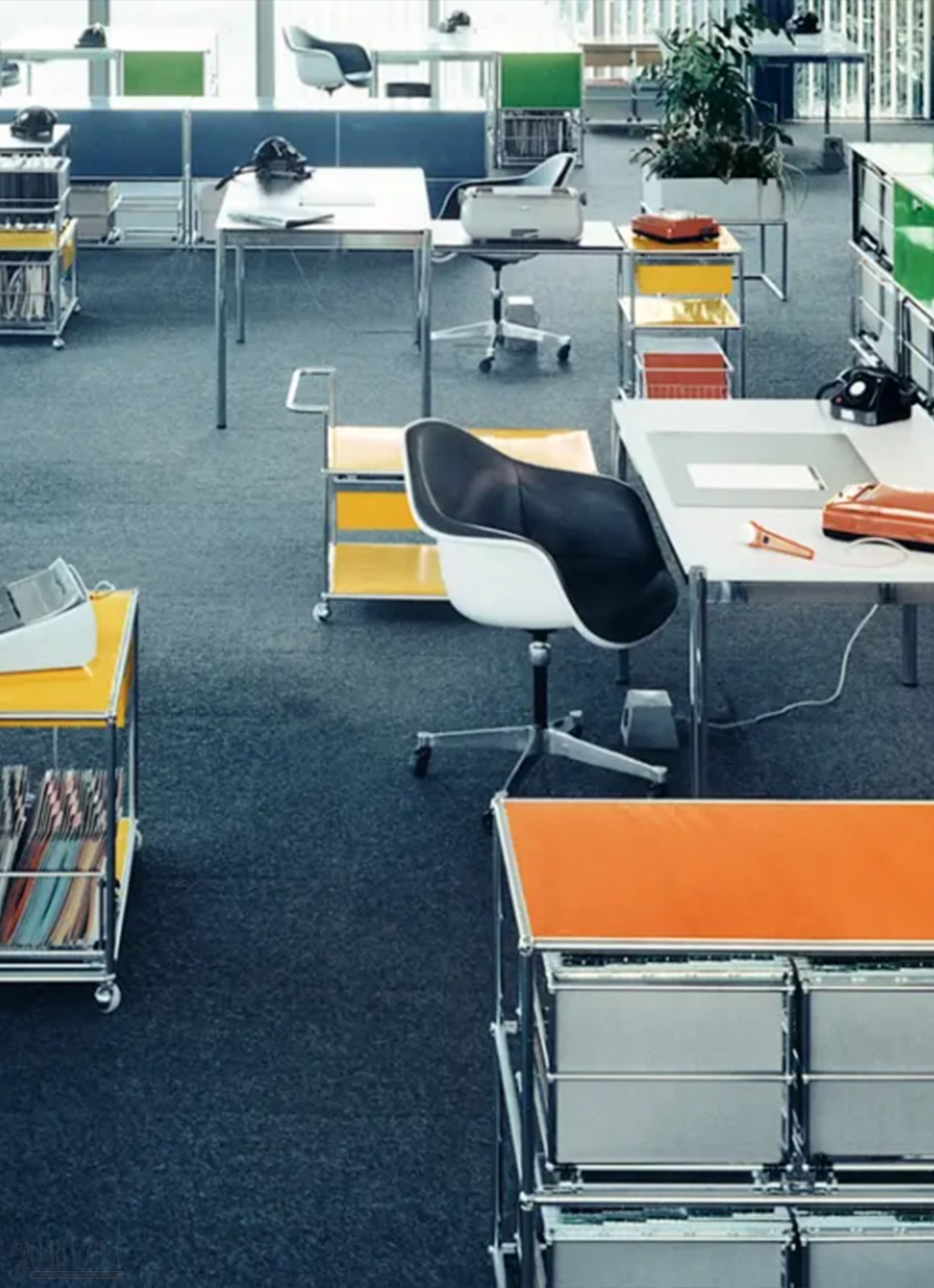 USM Haller模块化家具系统,以镀铬钢管、球形连接件与彩色金属面板诠释工业美学