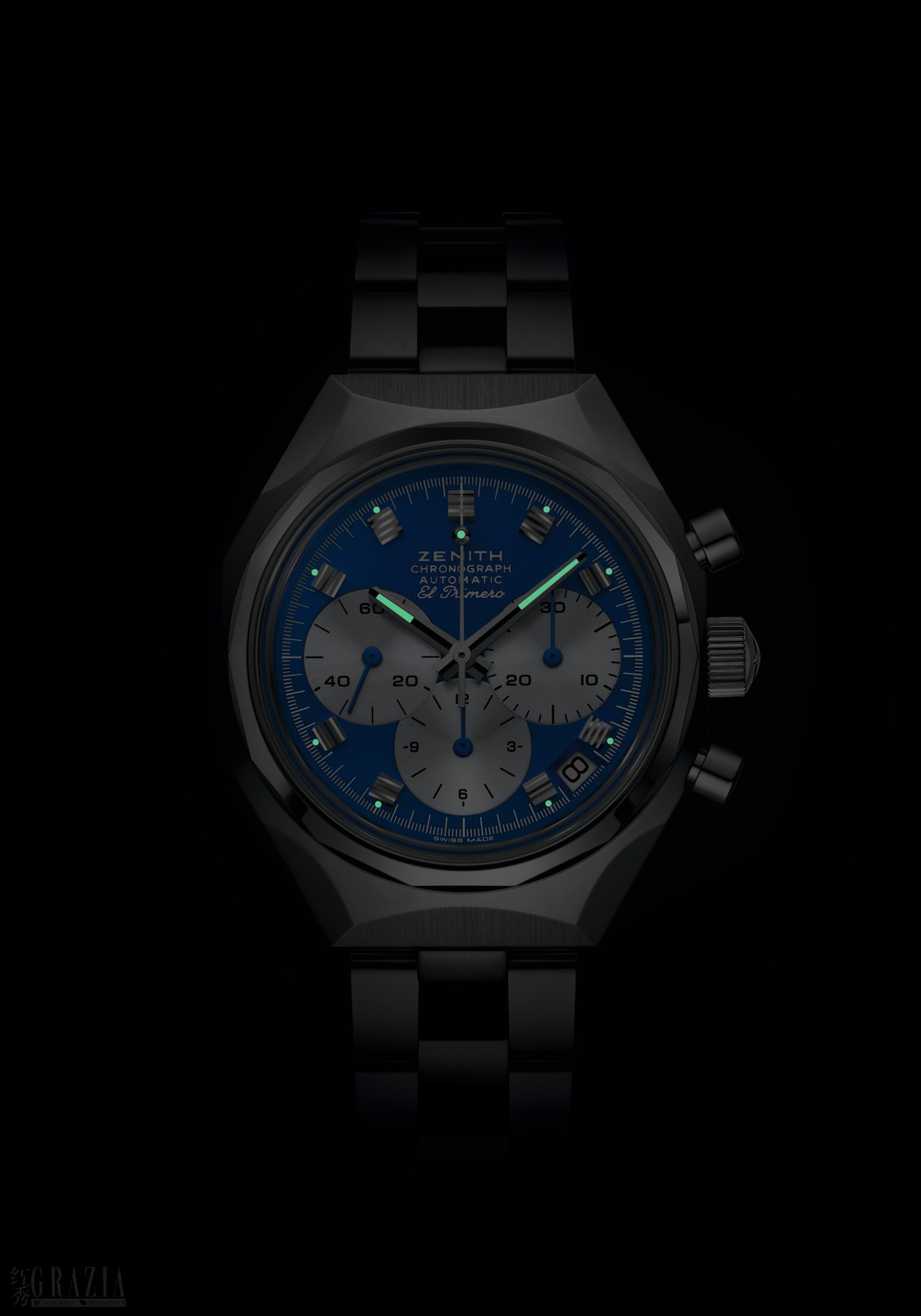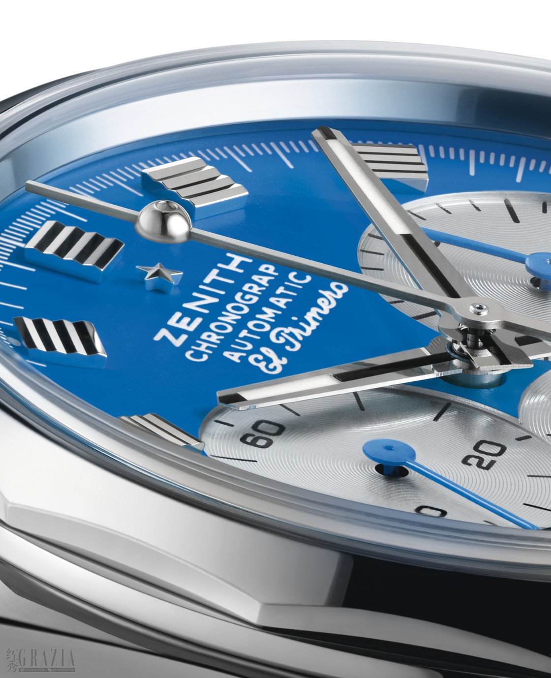 表盘藏有一处细腻而玩味十足的细节:计时秒针末端装饰有一枚玲珑有致的USM Haller球形连接件,并涂覆SuperLuminova超级夜光物料,确保昏暗环境下依旧能够清晰读时。当计时功能启用后,隐匿其下的ZENITH真力时星形标志便悄然浮现,流露出腕表所蕴含的叙事巧思。每种配色的腕表限量发行60枚。