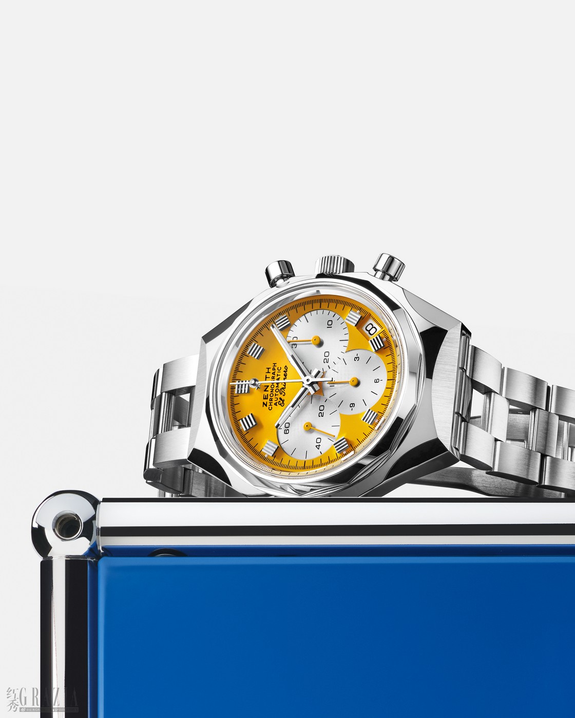 为实现此次别开生面的合作,ZENITH真力时与USM深入追溯了20世纪60年代大胆前卫的时代精神——那是一个重塑形式与功能的变革时代,也恰是两大品牌发展历程中里程碑式的关键节点。怀着“倘若当年便携手合作,会创作出怎样的传世之作?”的设想,两大品牌由此展开创作之旅,构思出一款前所未有的时计——它不仅超越时空的构想,更精准传达出那个时代所特有的美学语言与文化意涵。