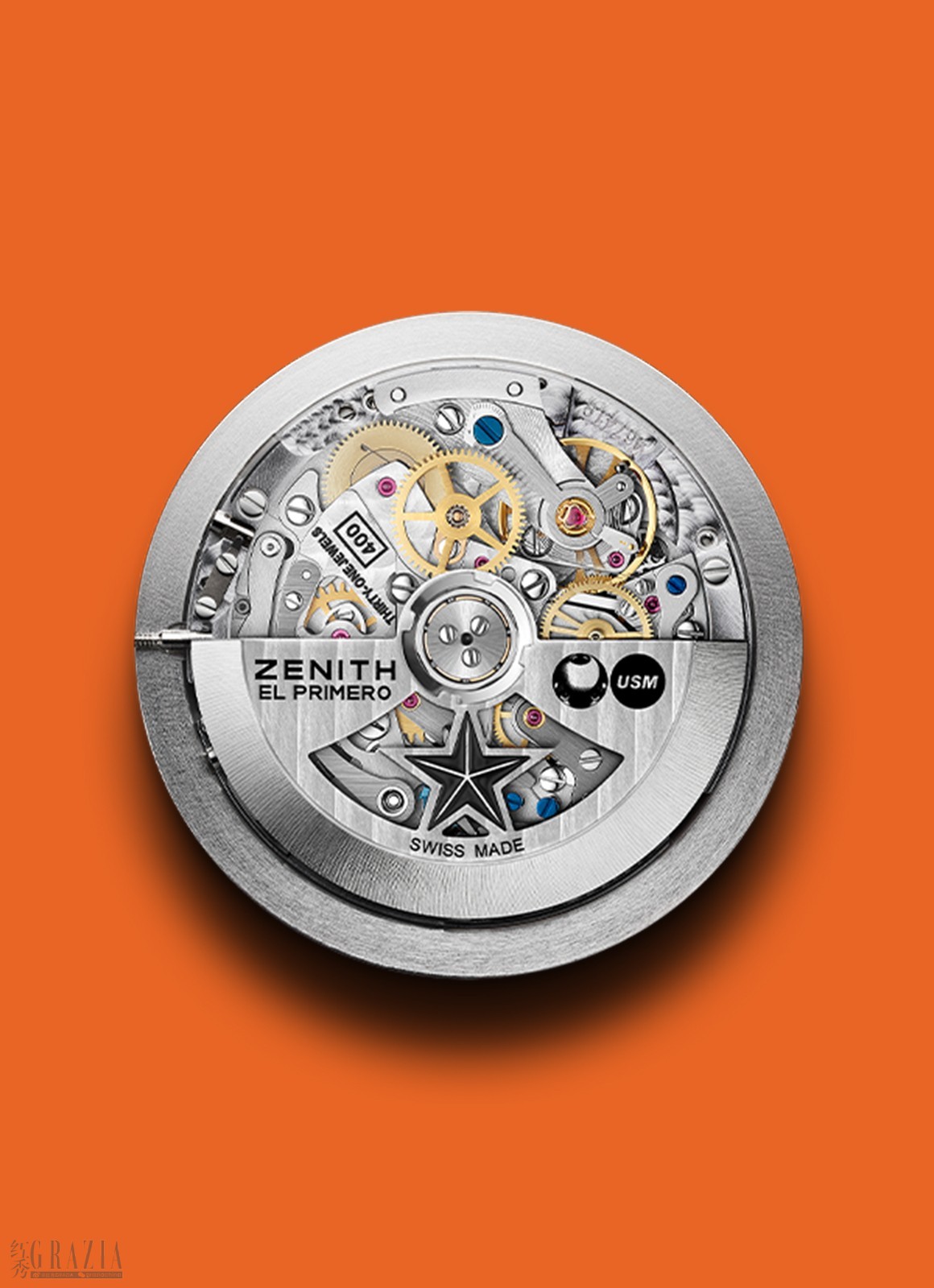 修饰:摆陀饰以“日内瓦波纹”(Côtes de Genève)图案,并镌刻以Zenith 与USM标志。