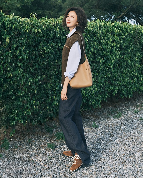 贾静雯身着美利奴羊毛衫,棉质罗纹Logo短袖T恤,牛仔半裙,波浪形耳环,FIELD户外运动鞋,携ROMY绒面革水桶包;身着羊毛背心,棉质衬衫,拉链牛仔裤,波浪形耳环,FIELD户外运动鞋,携ROMY肩背包。