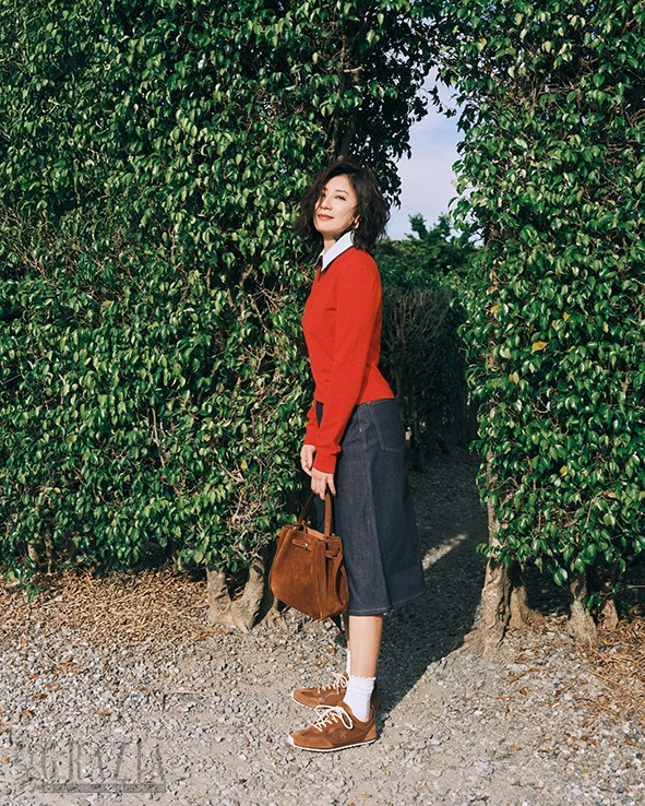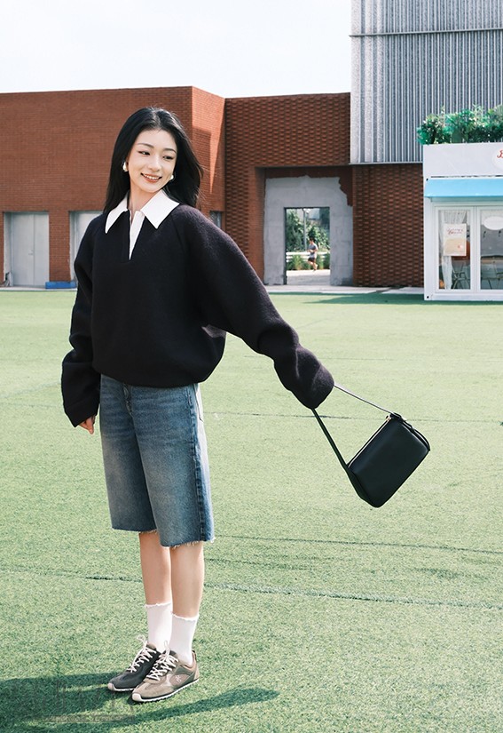 王和身着羊毛POLO衫,牛仔短裤,波浪形耳环,FIELD户外运动鞋,携ROMY小号肩背包。