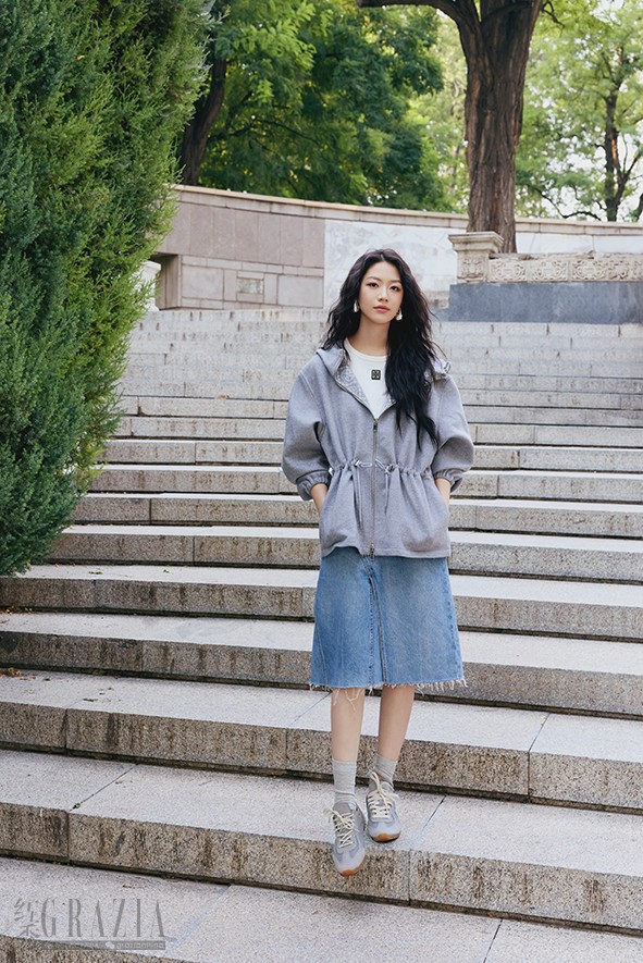 向涵之身着 T MONOGRAM双面穿宽松提花连帽外套,棉质罗纹Logo短袖T恤,牛仔半裙,波浪形耳环,FIELD户外运动鞋;