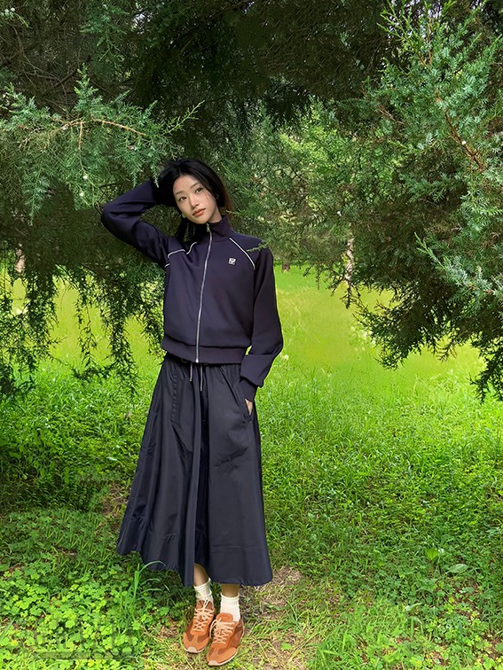 段晓薇身着短款运动夹克,棉质衬衫,尼龙半裙,小号波浪形耳环,FIELD户外运动鞋;
