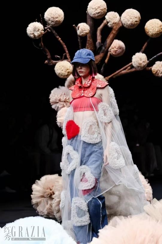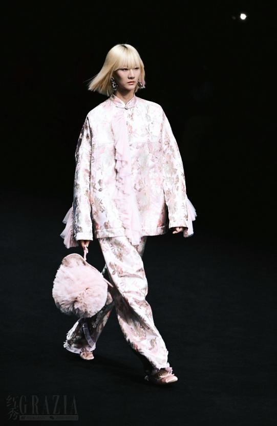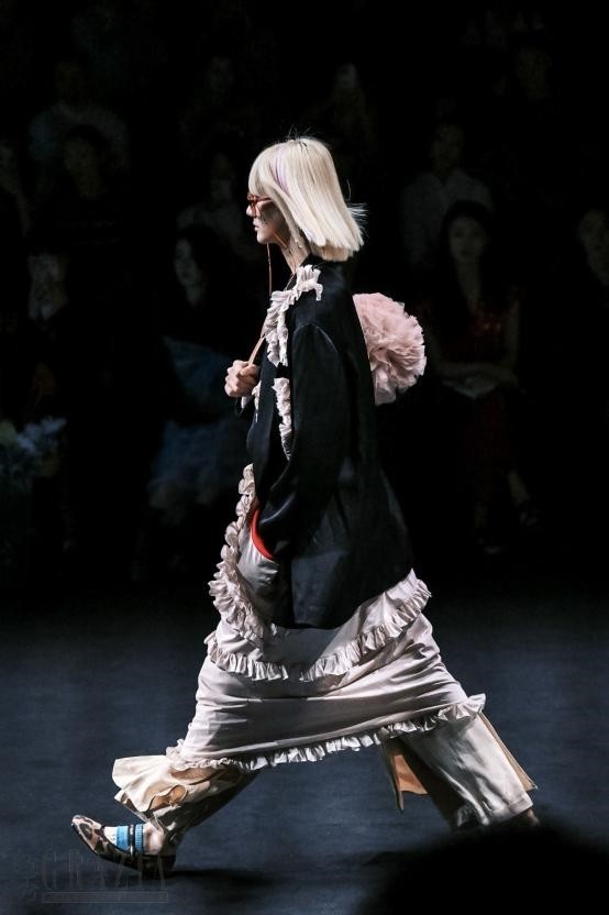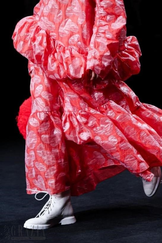 暗黑牛仔外套内里绣有若隐若现的粉色爱心,皮质短裙的磨损爱心口袋盖暗藏反叛。设计师以“藏”代“显”,让甜美元素成为酷感态度的隐秘载体。