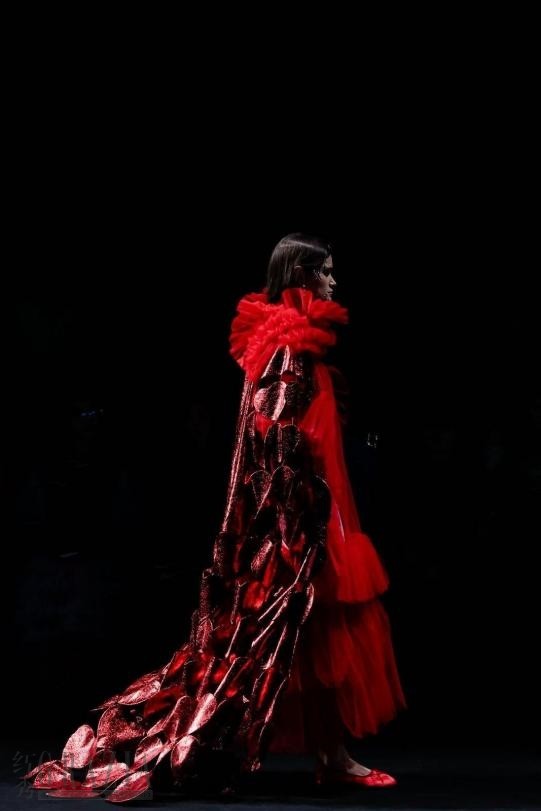 粉色欧根纱花瓣缠绕金属腰链,柔软与锋利形成视觉对冲;暗黑连衣裙的裙摆以不规则花瓣裁片拼接,毛边处理模拟“花瓣绽于刀刃”的冲突感。这一系列以EVVLY独有的浪漫主义,诠释温柔与锋芒的共生。
