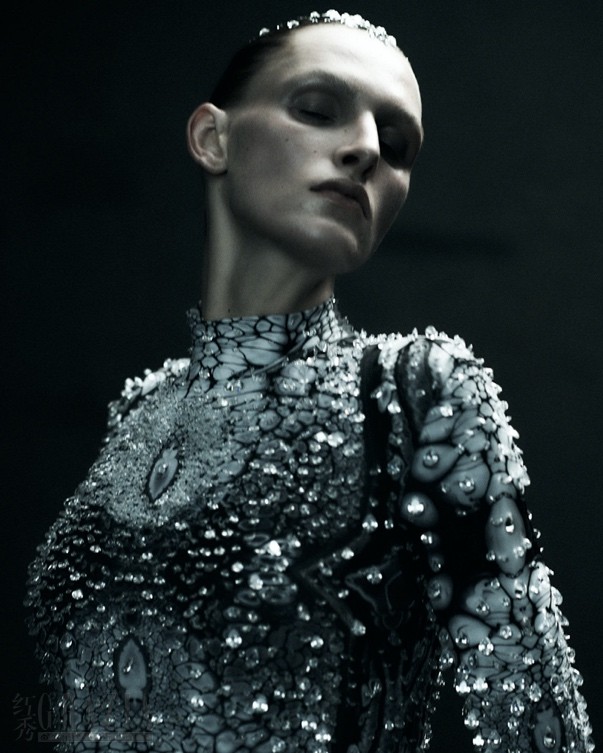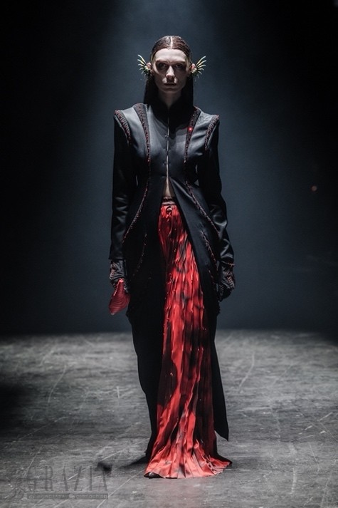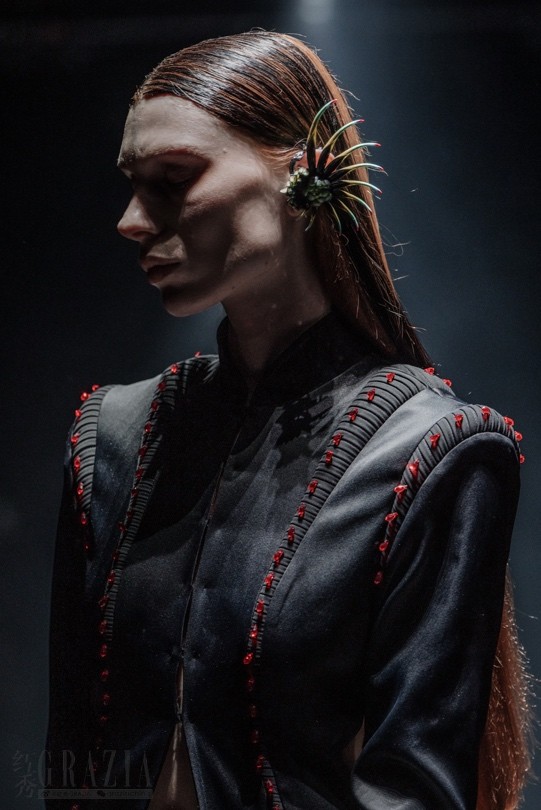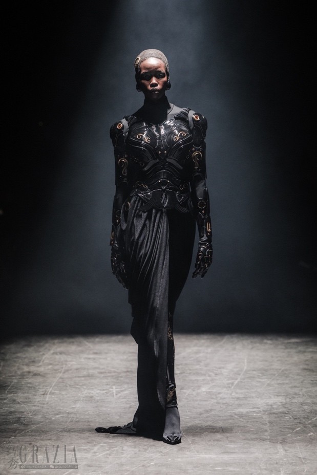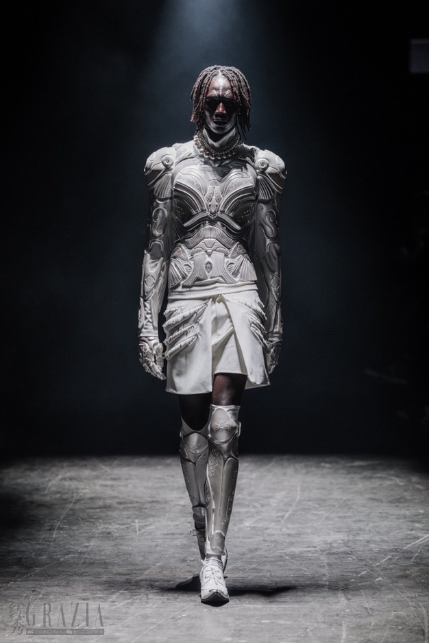 HENGDI WANG SS26系列以“外源生命起点”为核心灵感,将身体重塑为一个延展的有机体。系列巧妙融合东方神话与后人类生物构造、未来材料与数字工艺,旨在构建一种跨越神话、技术与未来语境的时装宇宙,。设计元素上,中式古代青铜雕塑与甲胄被转化为未来感的外骨骼形态;骨骼与仿生结构与 Karl Blossfeldt 的植物几何学、恩斯特·海克尔的生物对称性相互交织;同时,传统刺绣、提花工艺与前沿的3D打印及算法技术并置,共同编织几何与星云图案的视觉诗篇。