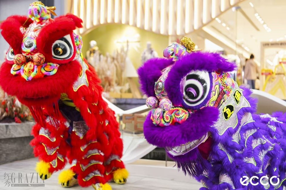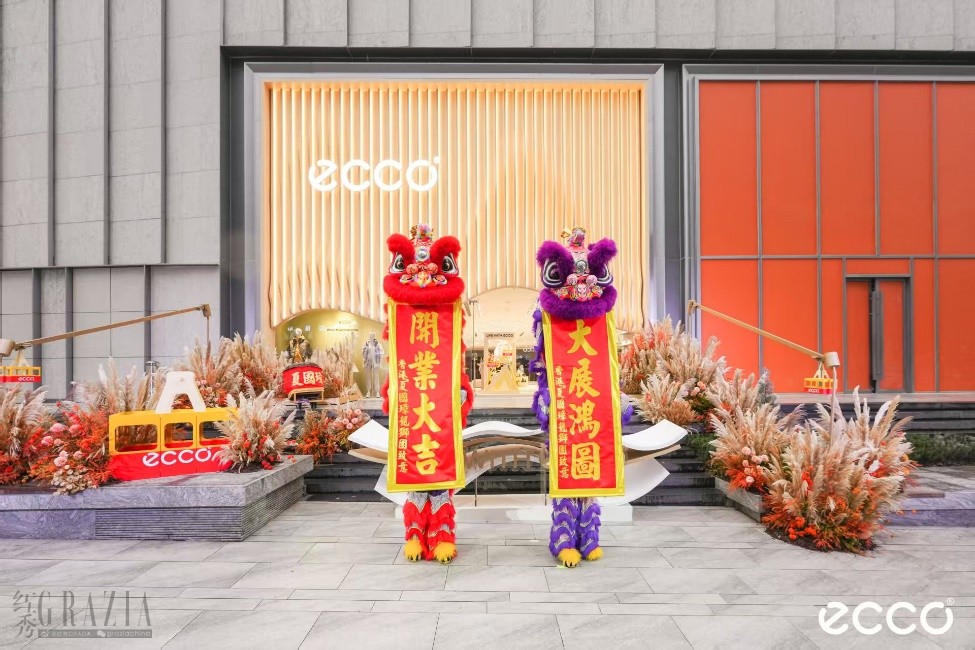 同时,现场还特别开展了承载传统底蕴的醒狮点睛仪式,在喧腾的锣鼓声中,品牌代言人黄景瑜与ECCO大中华区总经理董江白女士共同执笔,为紫、红双狮点睛启祥,注入生机灵气。更有气势恢宏的舞狮表演点燃全场,祥狮随铿锵节奏欢腾起舞,以传统之礼,寄托对ECCO全新户外运动店开业的美好祝愿。由瑞狮引路,众宾随之一同入店探寻,舞狮昂首阔步,辗转腾挪间尽显灵动神韵,终一跃登高采青,为新店送上祥瑞。