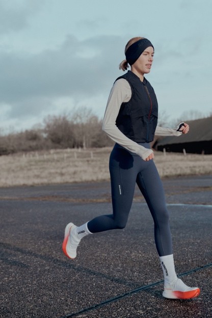 跑中套装则进一步强化动态平衡,在寒冷天气的高动态场景下打造兼具保暖和透气的动态平衡体验。跑步背心亦配备胸肩部的可拆卸隔热片,灵活适配不同跑步强度。保暖跑步夹克采用羽绒填充管状隔断结构,实现均匀保暖的同时,有效减少冷缝与钻绒,助力运动中的稳定表现。